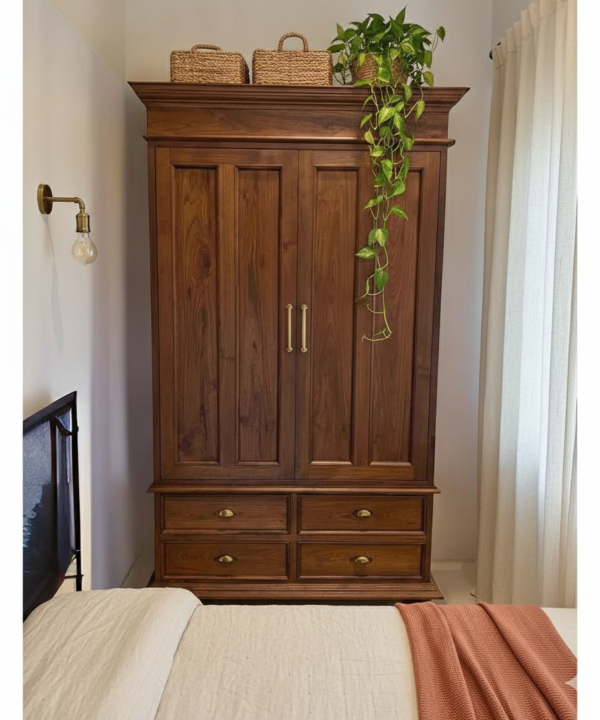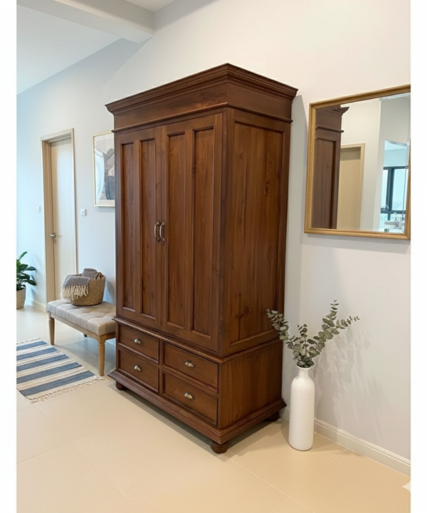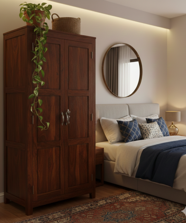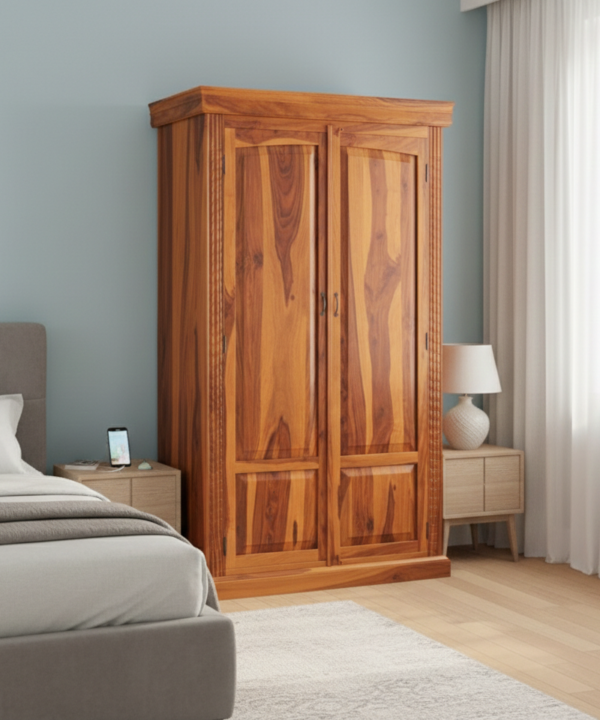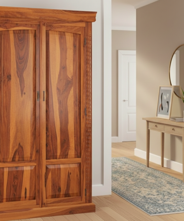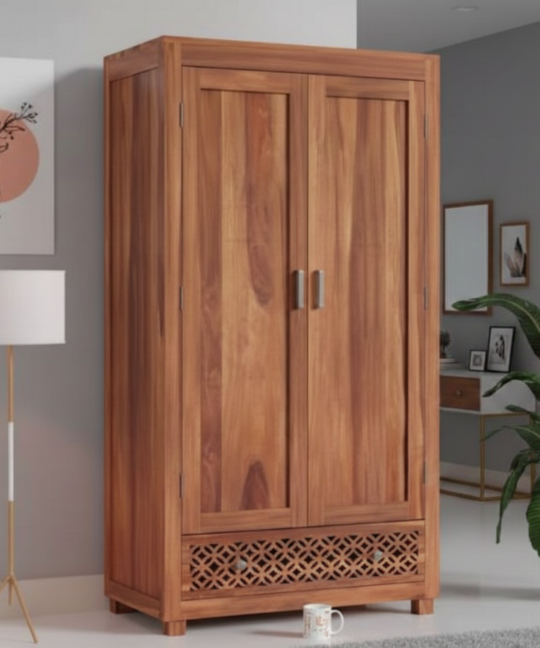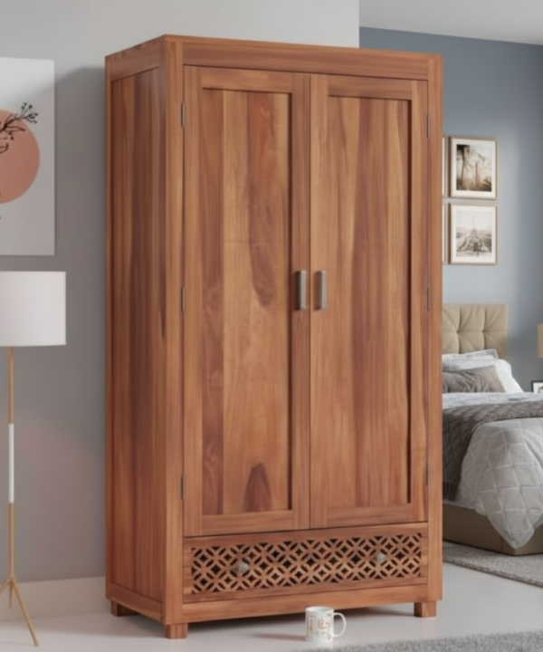 Teak Wood Two-Door Wardrobe with Mirror & Carved Design