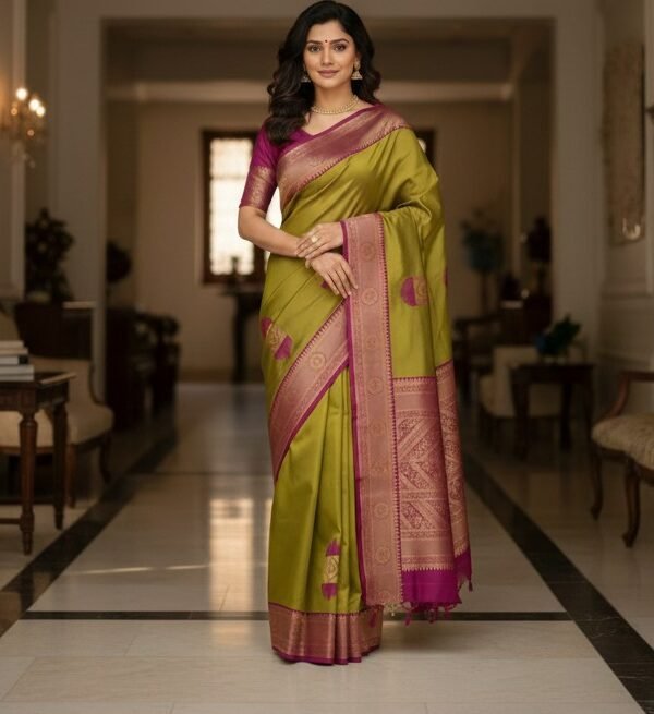 Regal Olive & Magenta Kanchipuram Silk Saree with Traditional Zari Border