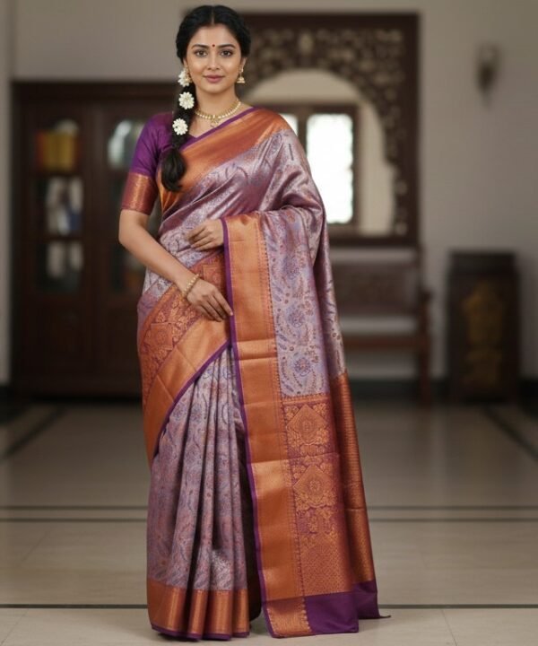 Exquisite Lavender-Grey Kanchipuram Silk Saree with Antique Gold Zari & Purple Border