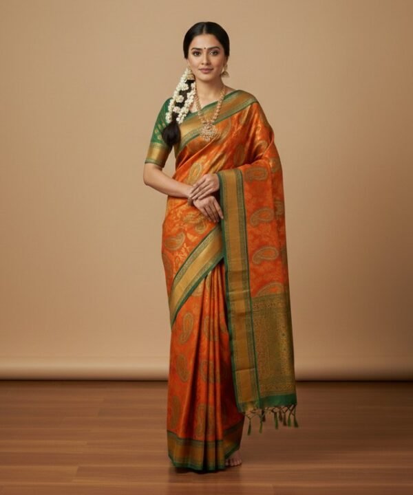 Sunset Amber Kanchipuram Silk Saree with Emerald Zari Borders