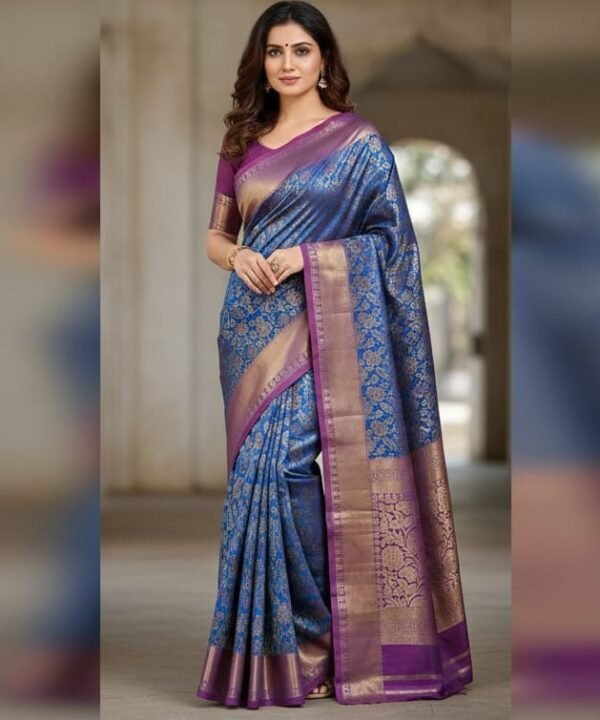 Royal Blue Kanjivaram Silk Saree with Antique Gold Zari & Floral Brocade