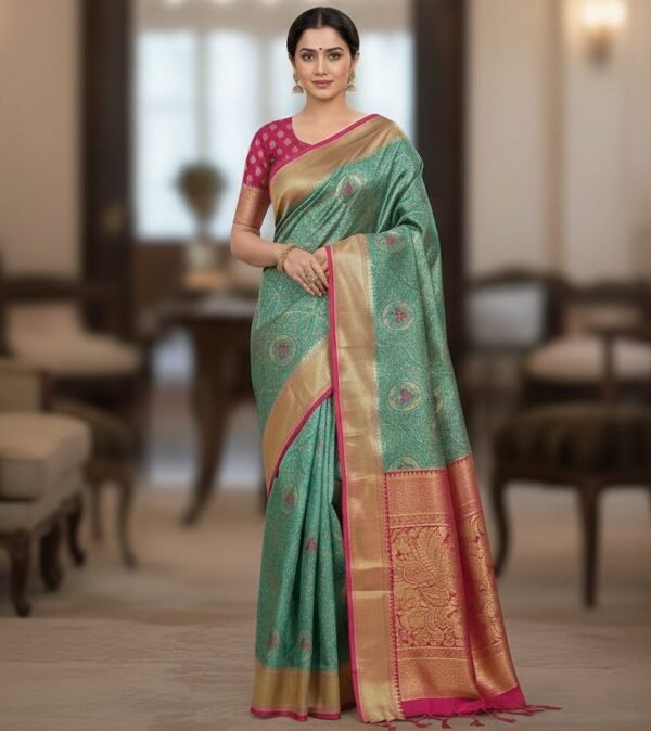 Black Soft Silk Saree with Gold Zari Buttas and Maroon Border