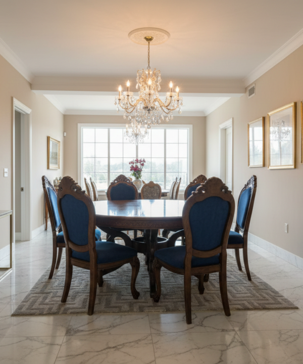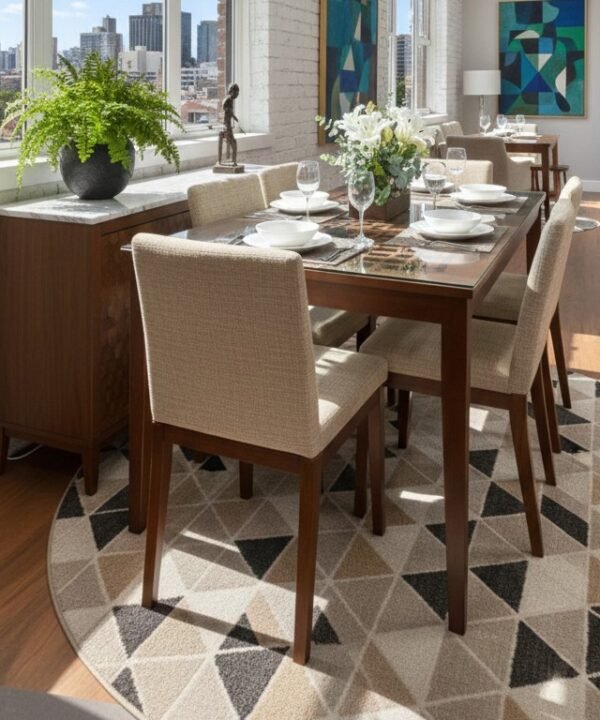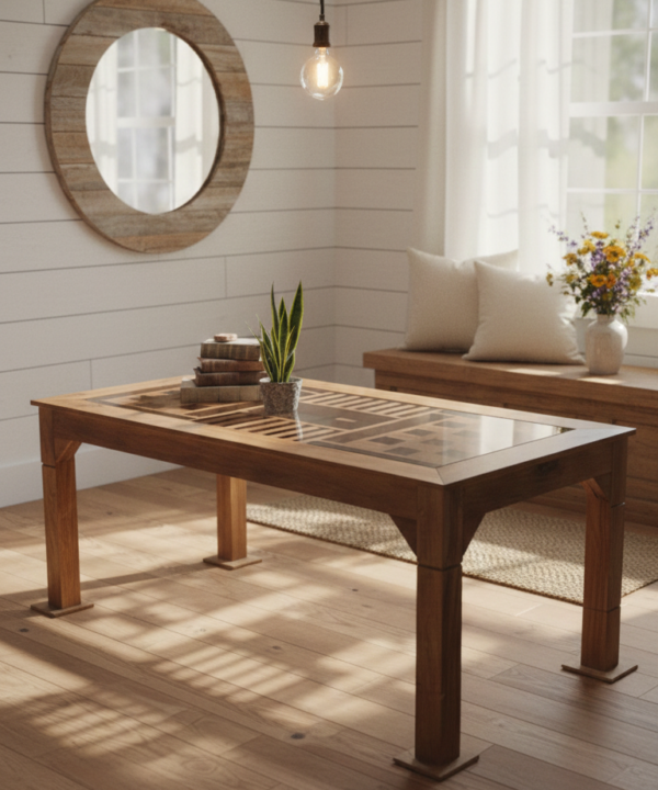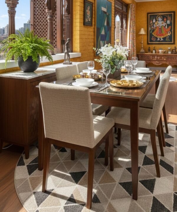 • Handcrafted Solid Wood 6-Seater Dining Set with Glass Top & Slatted High-Back Chairs Handcrafted Solid Wood 6-Seater Dining Set with Glass Top & Slatted High-Back Chairs