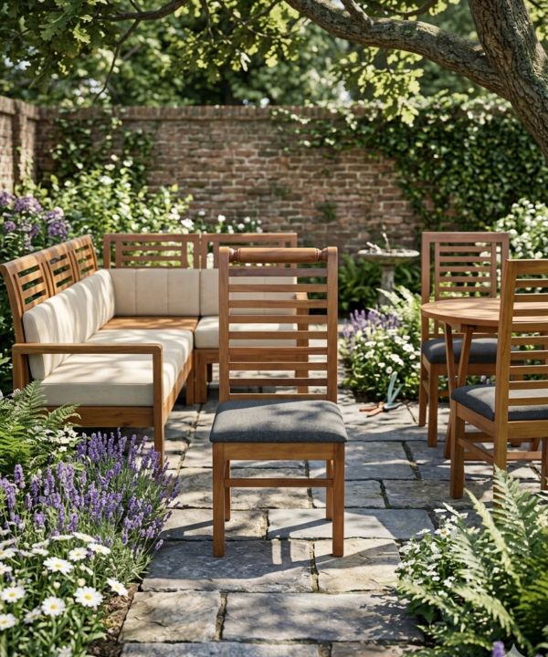 • Handcrafted Solid Wood 6-Seater Dining Set with Glass Top & Slatted High-Back Chairs Handcrafted Solid Wood 6-Seater Dining Set with Glass Top & Slatted High-Back Chairs