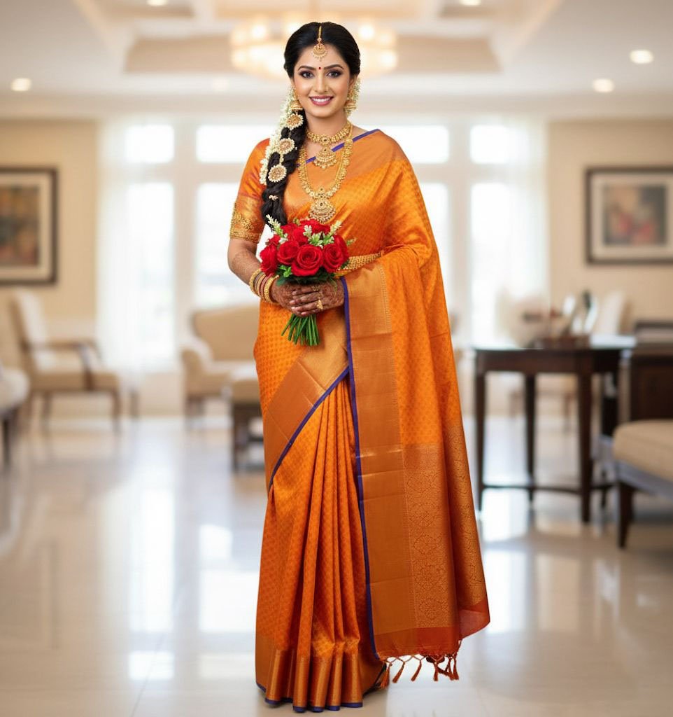 Bright orange soft silk saree with subtle woven motifs and a copper-gold border finished with blue piping—perfect for daily ethnic wear, pujas, and light festive occasions.