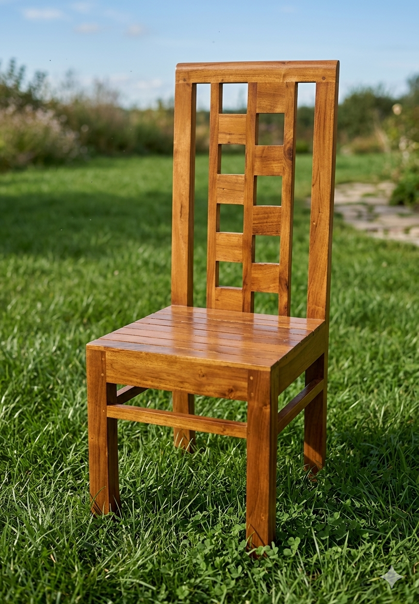 This premium dining chair is expertly carved from authentic Nilambur Teak, a wood variety celebrated for its rich honey-gold hue and superior longevity. The standout feature of this piece is its intricate lattice-style backrest, which showcases a beautiful interplay of vertical and horizontal wooden blocks, reflecting the fine artisanal heritage of Kerala.