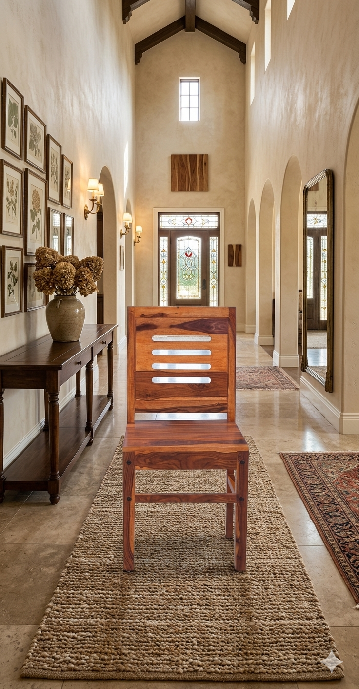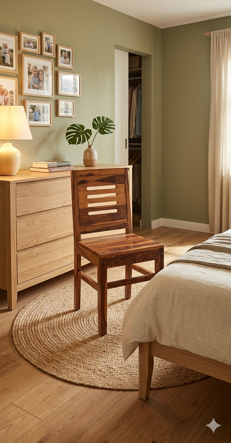 This dining chair showcases the bold, expressive grain patterns typical of authentic Kerala Nilambur teak wood. The piece is defined by its deep honey and burnt-umber tones, which highlight the wood’s high oil content and natural resistance to the elements. Its design balances a rustic, solid feel with a clean, functional silhouette.