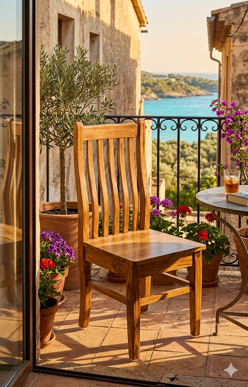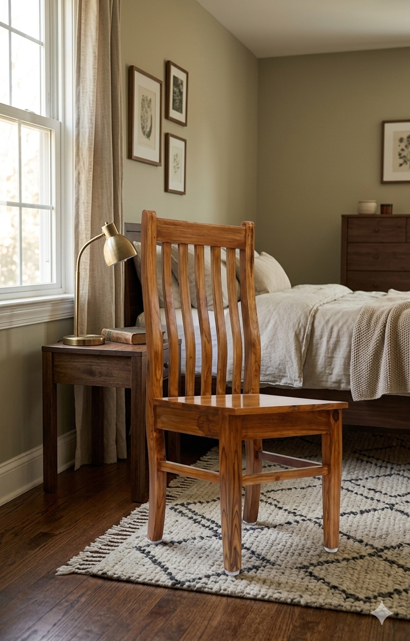 This elegant high-back chair is a masterpiece of traditional Kerala woodworking, crafted from world-renowned Nilambur teak wood. The piece is characterized by its brilliant golden-yellow luster and the remarkably straight, clean grain patterns that are a hallmark of teak grown in the Nilambur region. Its design features graceful, vertical curves that provide both aesthetic appeal and superior ergonomic comfort.