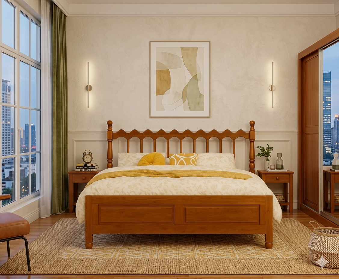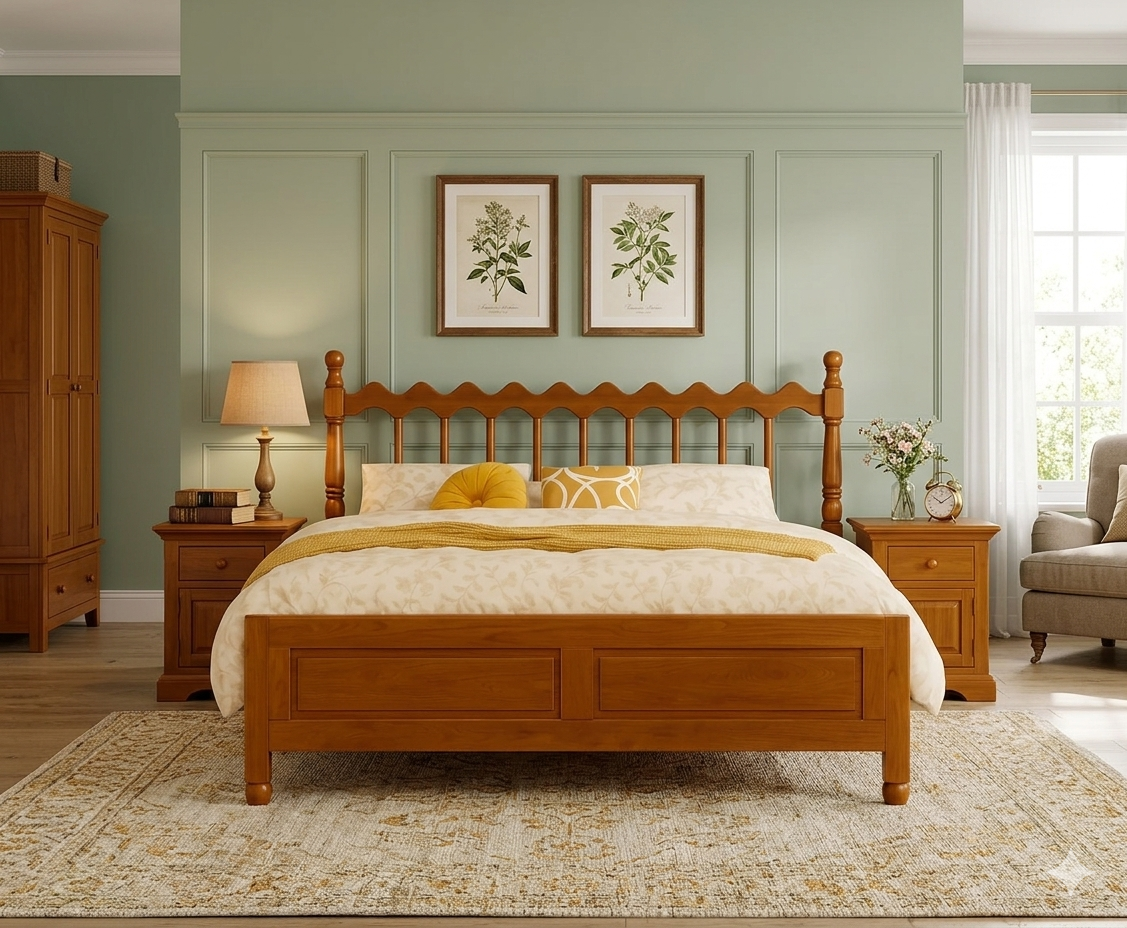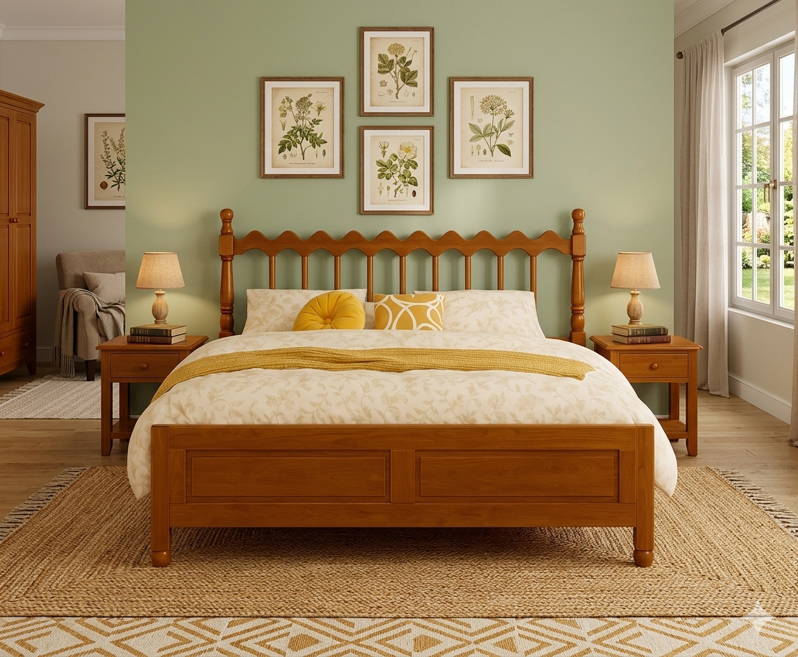This elegant bed frame is a sophisticated example of Kerala’s woodworking heritage, expertly carved from authentic Nilambur Teak. It features a classic spindle-back design that balances traditional charm with a light, airy aesthetic.