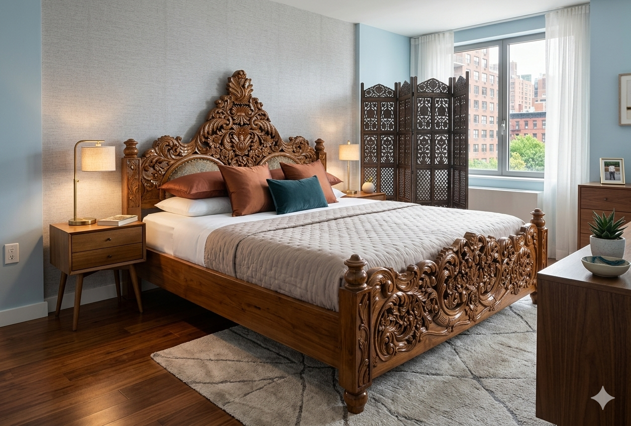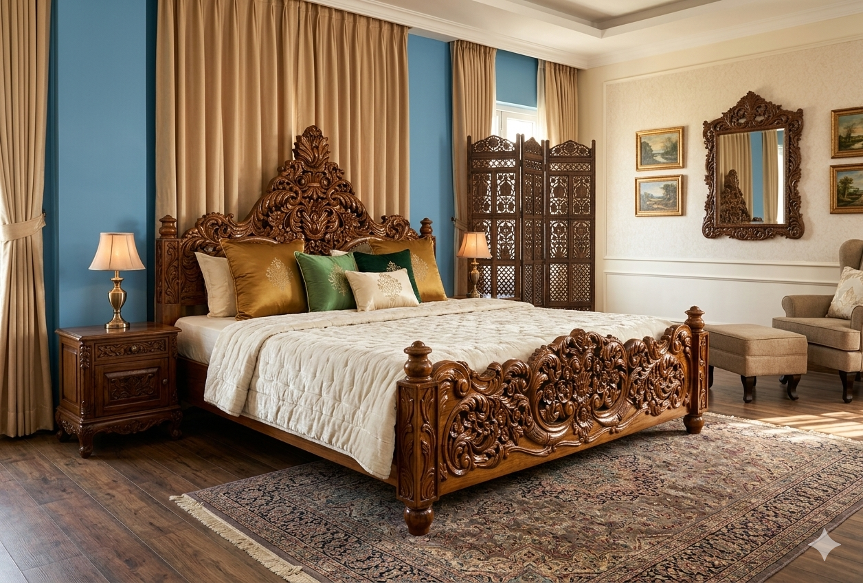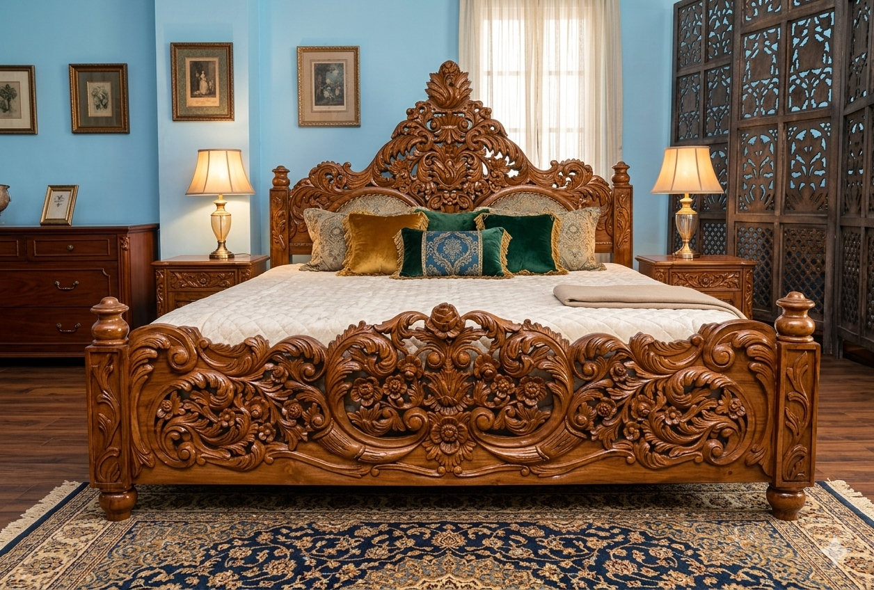 This grand bed is a masterpiece of royal Kerala artistry, meticulously hand-carved from authentic Nilambur Teak. It represents the pinnacle of traditional luxury, featuring heavy relief work that showcases the unmatched durability and fine grain of world-class teak.
