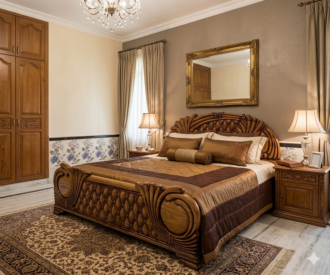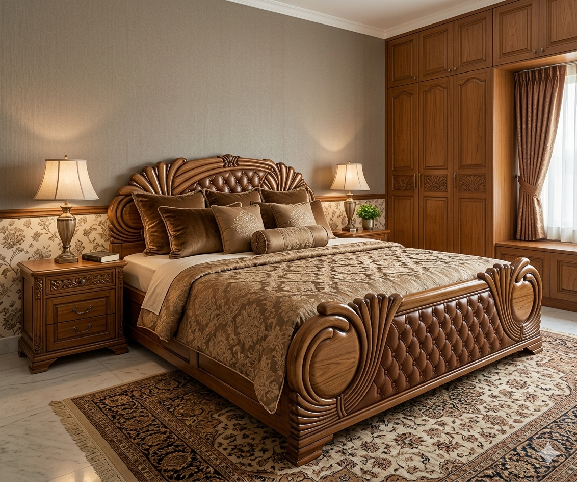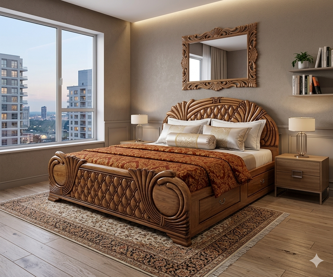 • Ornate Hand-Carving: The headboard and footboard feature a stunning “Peacock-fan” motif and diamond-quilted wood textures, showcasing the high-level artistry of Kerala craftsmen.