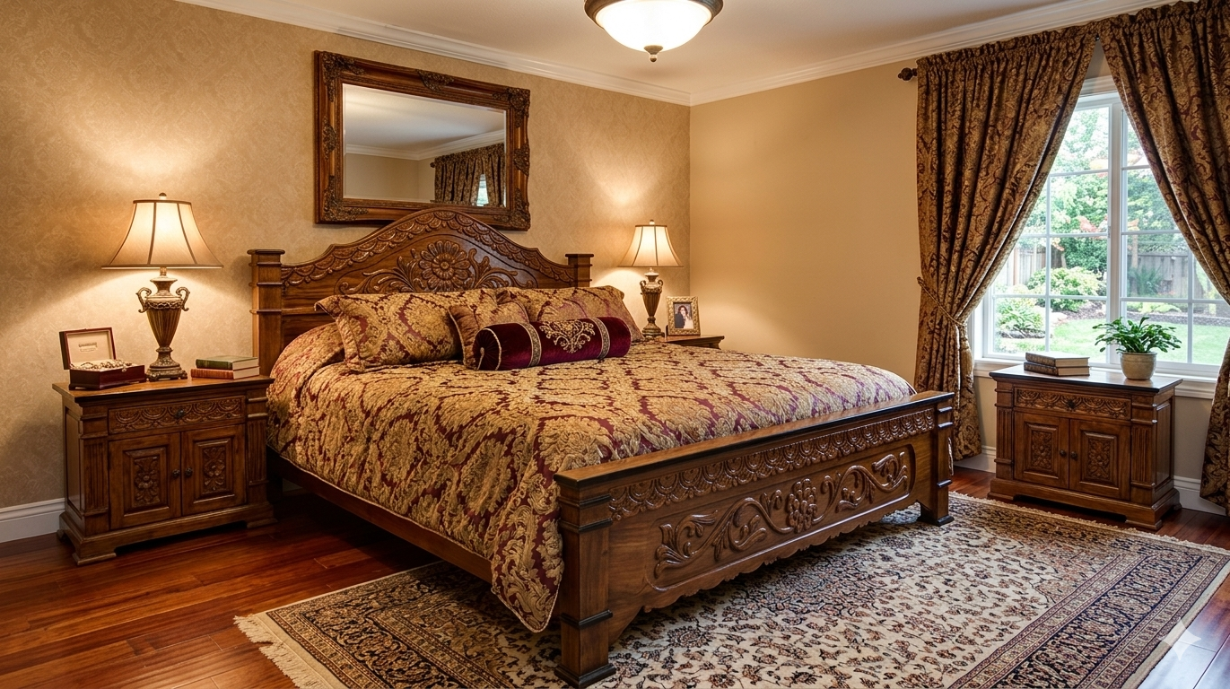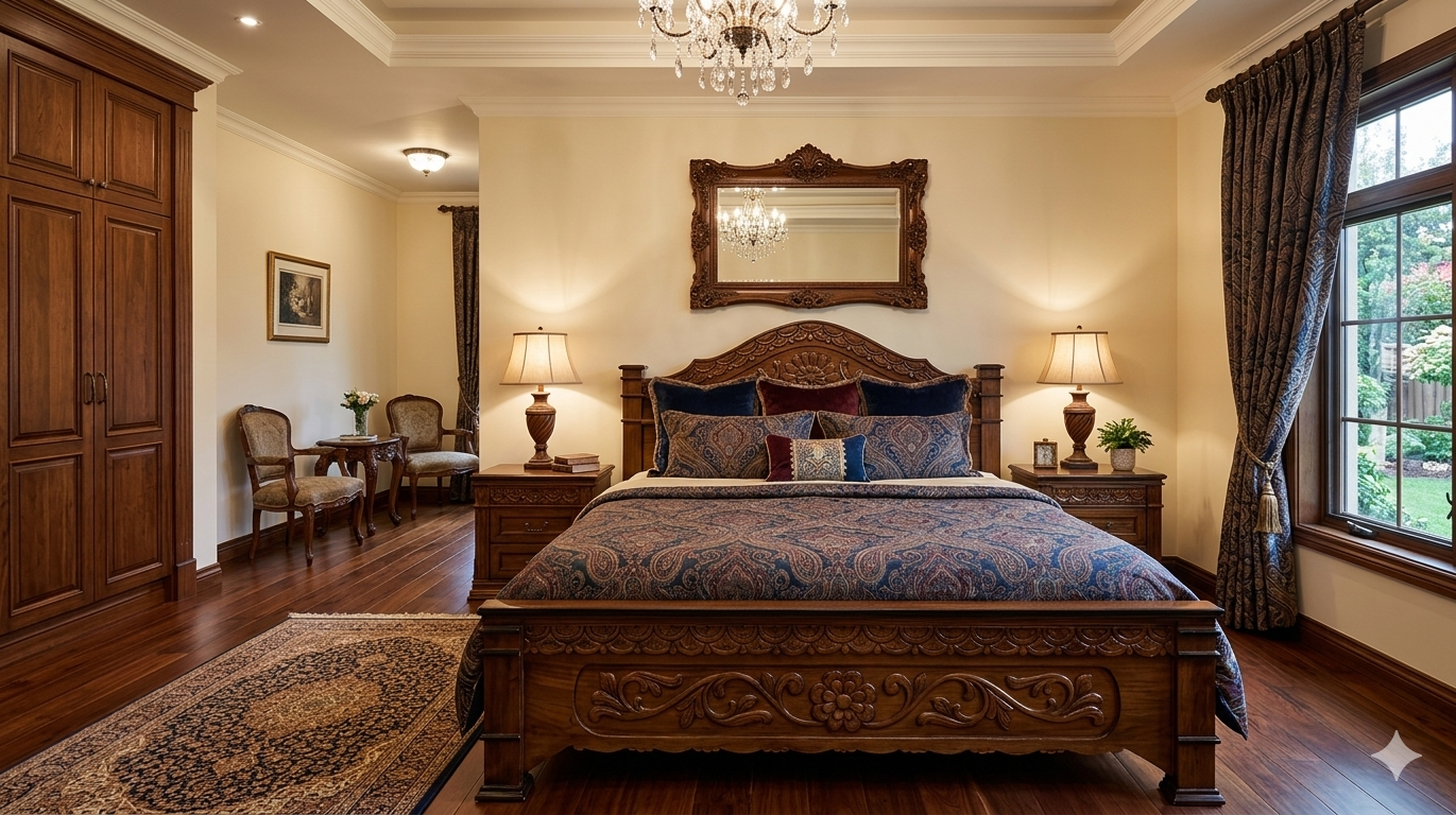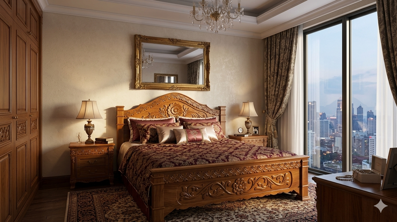 This magnificent bed frame is a celebration of heritage and luxury, meticulously crafted from the world’s finest Kerala Nilambur teak wood. Featuring a deep, chocolate-gold finish, this piece highlights the dense grain and high oil content that Nilambur teak is famous for, ensuring a lifetime of beauty and natural resistance to decay. The design balances a massive, sturdy presence with delicate, high-relief floral carvings.
