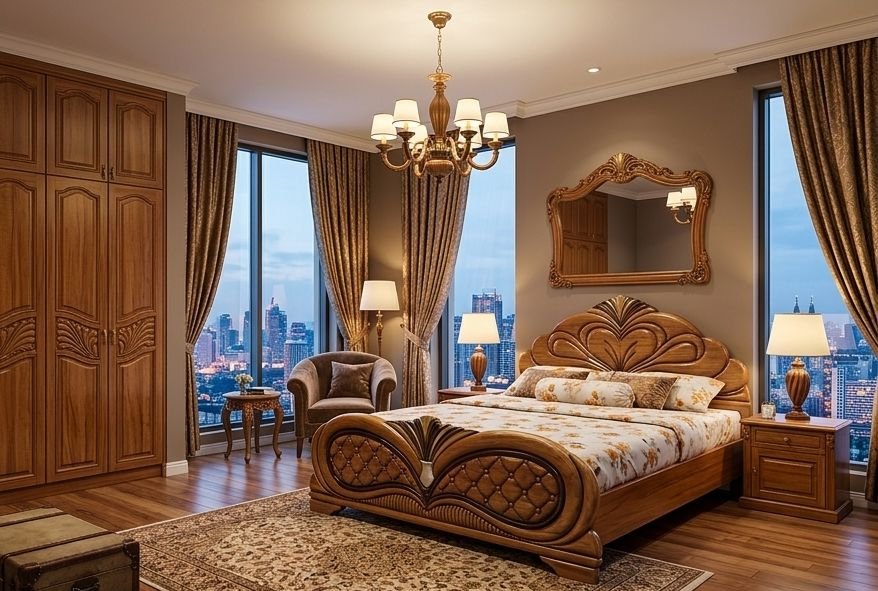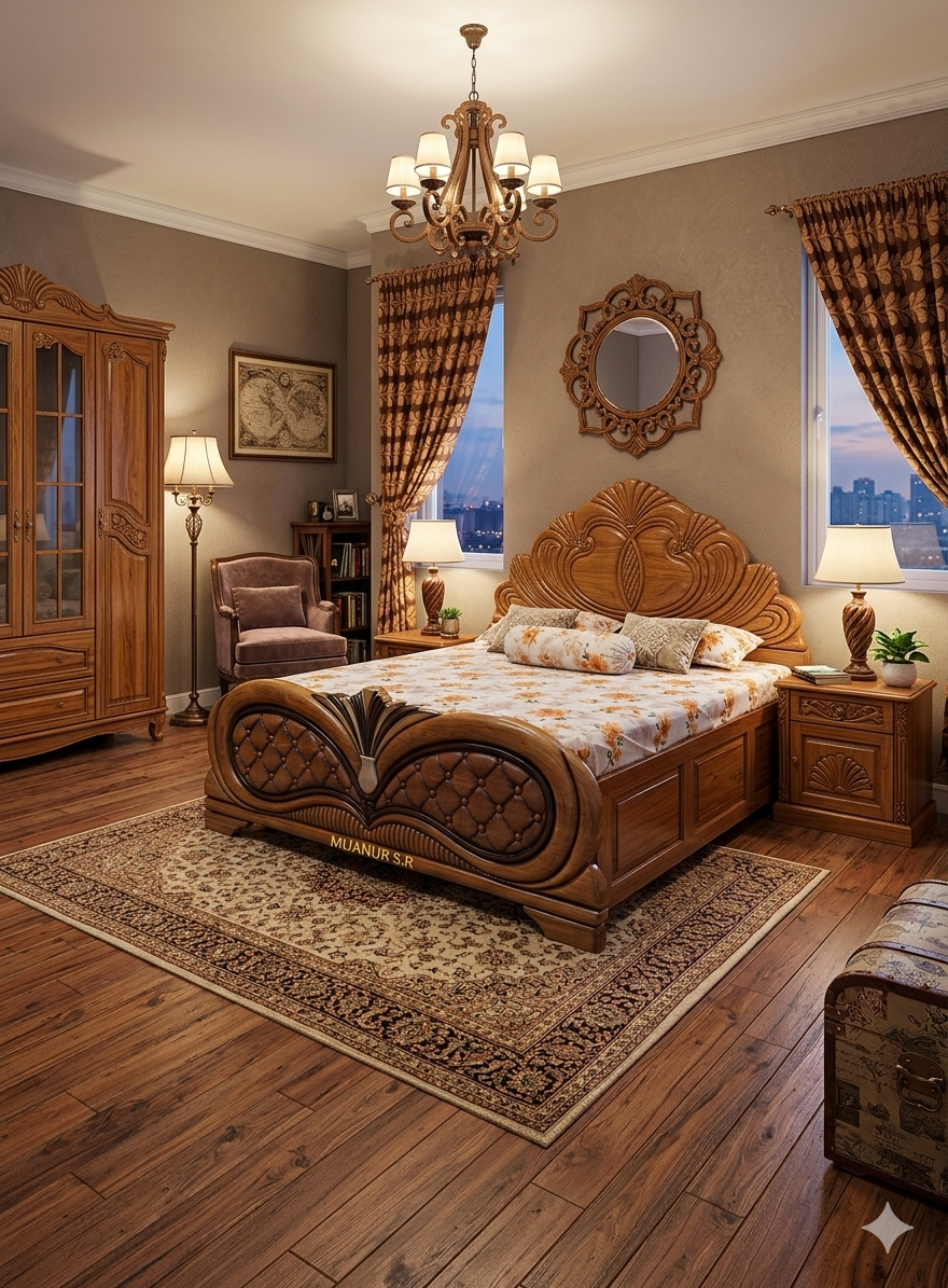 - Sunburst & Fan Carving: The headboard and footboard showcase a spectacular “Sunburst” fan motif, expertly carved to follow the natural grain of the teak wood.