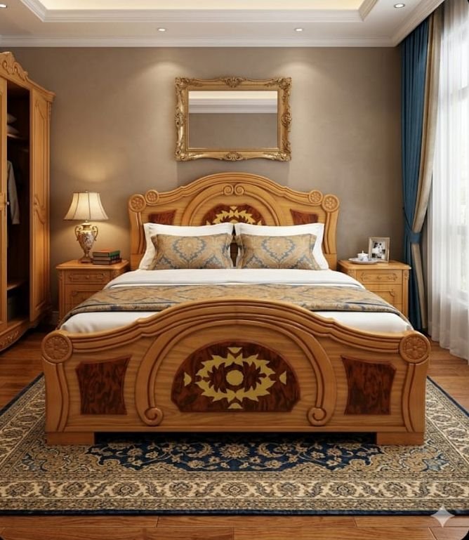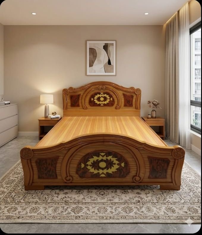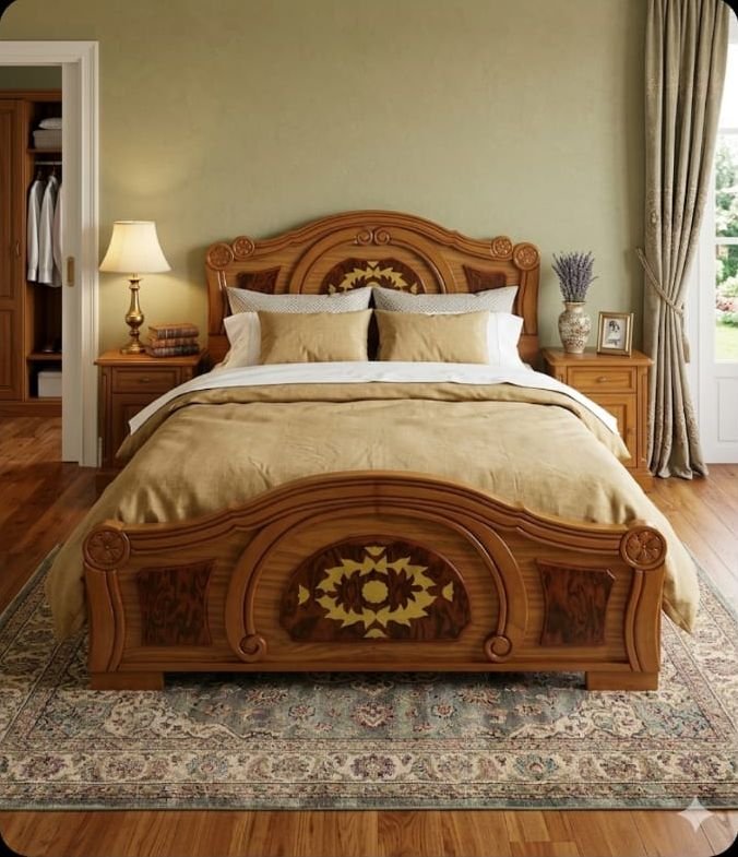 This is a Premium Kerala Nilambur Teak Wood Designer Bed, showcasing the rich, golden-brown luster and superior grain quality that makes Nilambur teak world-famous. This piece features a dual-tone aesthetic with ornate sunburst and floral medallion motifs centered on both the headboard and footboard.