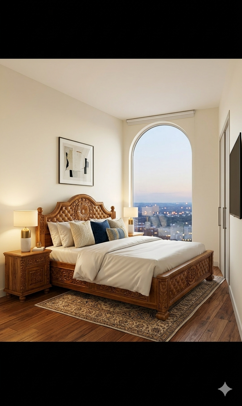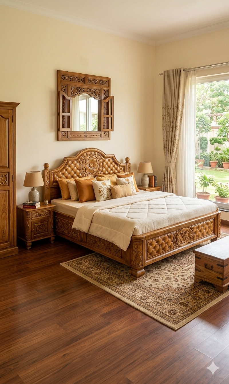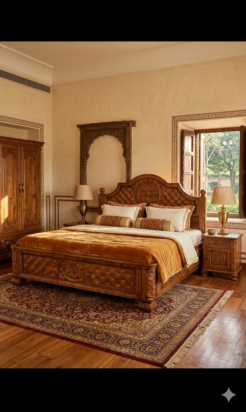 This premium king-size bed is a masterpiece of traditional craftsmanship, meticulously carved from authentic Nilambur Teak.
