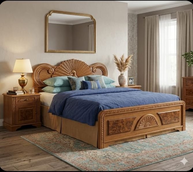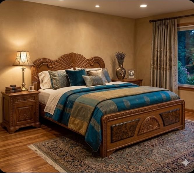 This is a Premium Kerala Nilambur Teak Wood Peacock Design Bed, a masterpiece of traditional craftsmanship. Carved from the world-renowned teak of Nilambur, this bed is celebrated for its rich golden-brown hue, dense grain, and natural resistance to pests and decay.