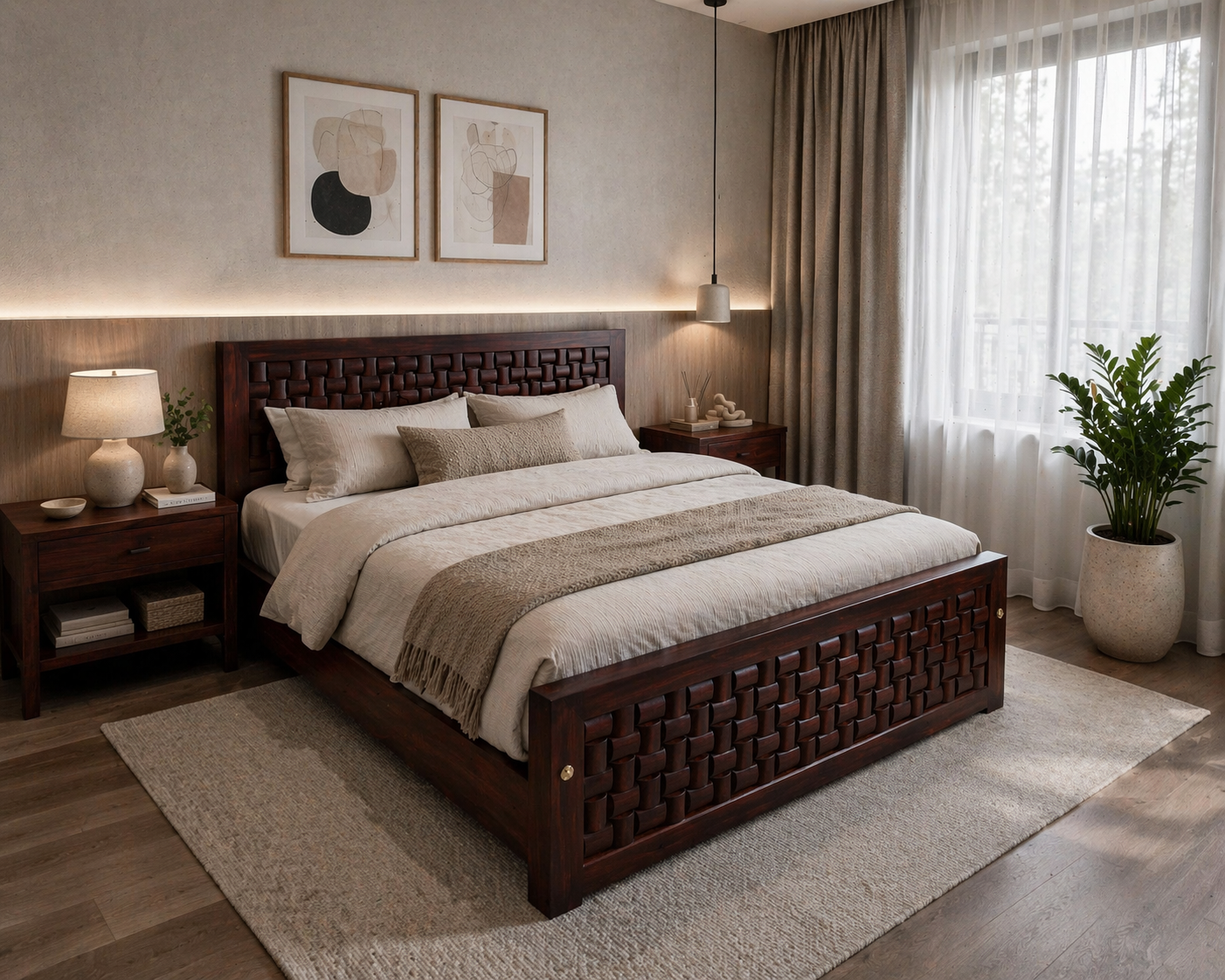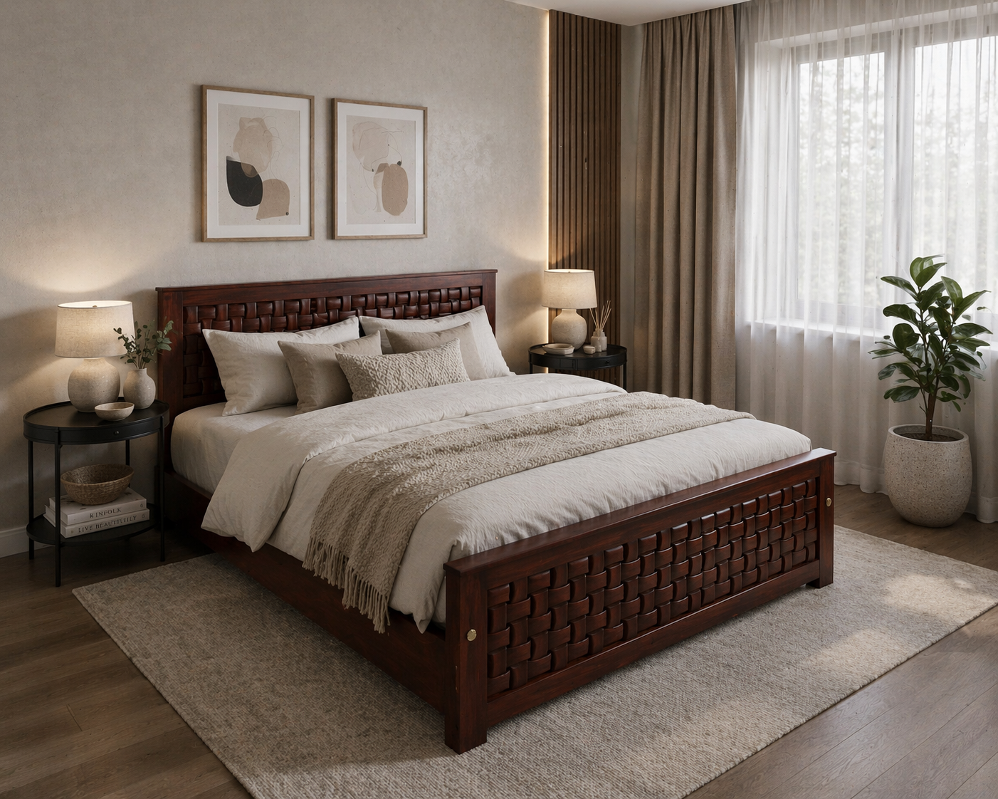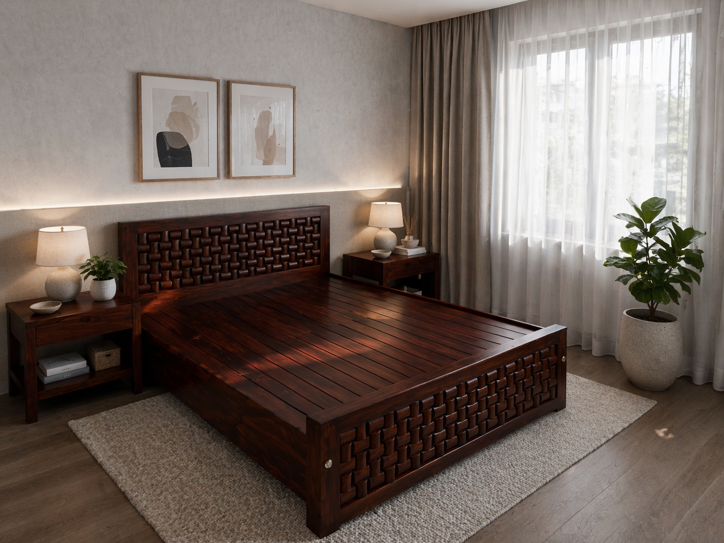 This masterfully crafted bed frame is made from authentic Nilambur teak wood, widely regarded as the finest quality teak in the world. Sourced from the historic plantations of Kerala, this timber is celebrated for its rich, deep tones and a natural oil content that provides unparalleled resistance to time and wear.