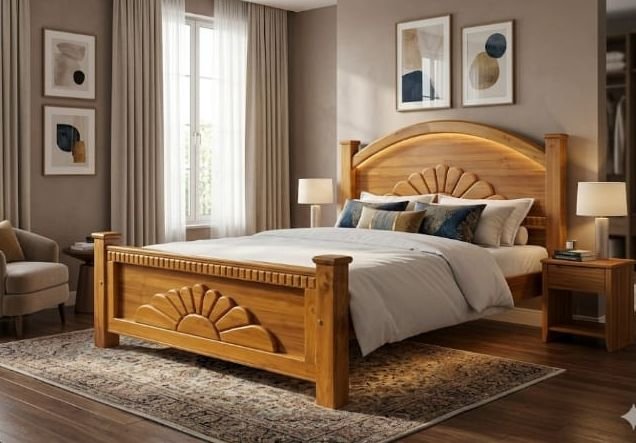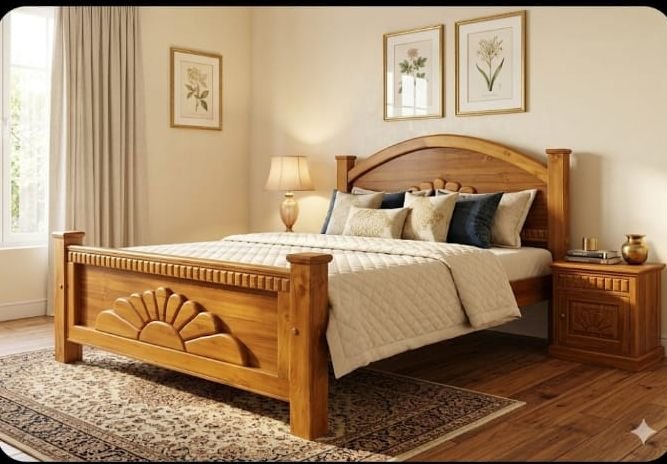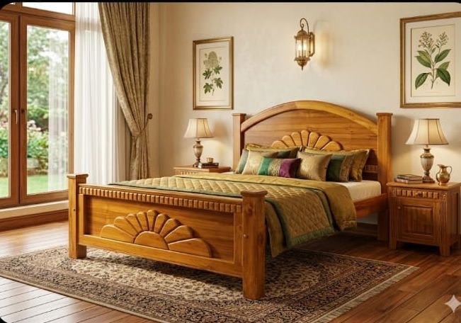 Bring the timeless charm of Kerala’s heritage into your bedroom with this masterfully carved bed, handcrafted from authentic Nilambur Teak. Known as the “King of Timbers,” this wood is celebrated for its exceptional strength, rich golden grain, and natural resistance to the elements.