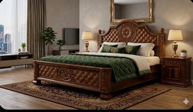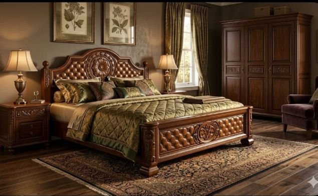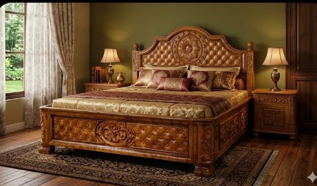 ​Infuse your home with the majestic aura of a Kerala palace with this masterfully hand-carved bed. This piece is meticulously crafted from 100% authentic Nilambur Teak Wood, globally celebrated for its unmatched durability, high oil content, and stunning golden-brown grain.