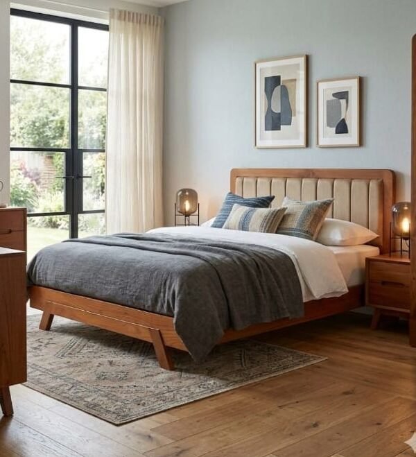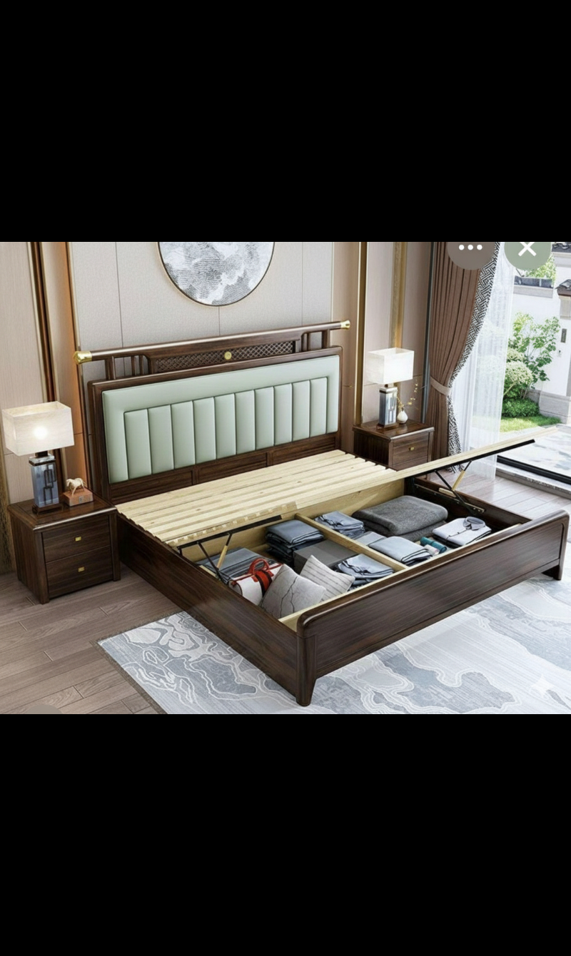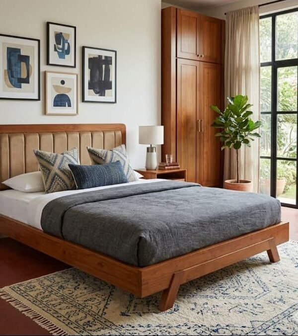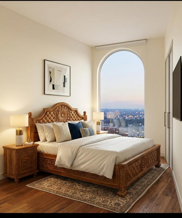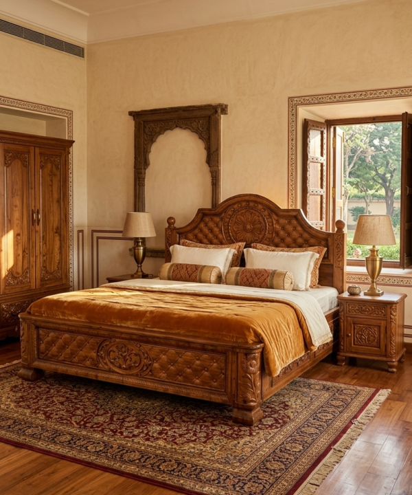 This premium hydraulic storage bed is a masterpiece of modern functionality blended with the timeless luxury of Nilambur Teak.