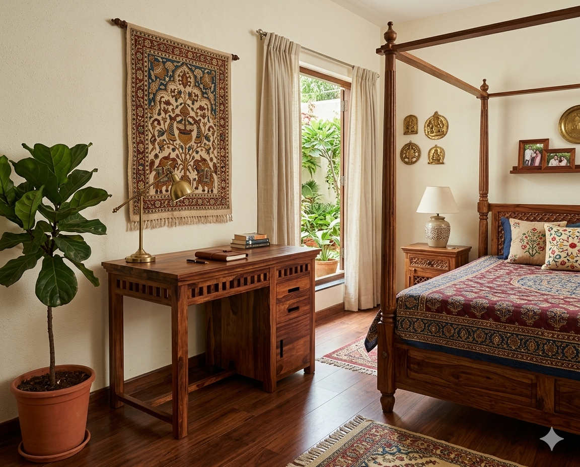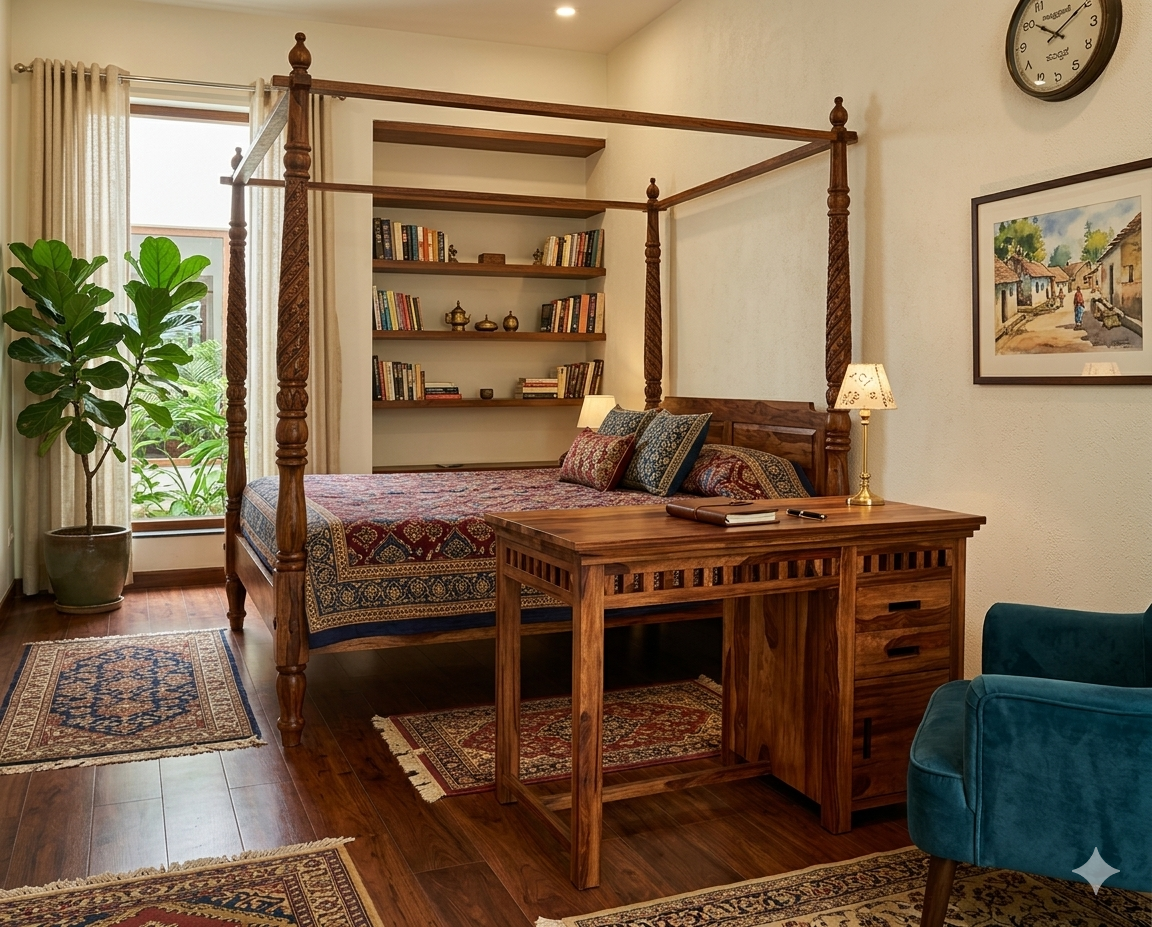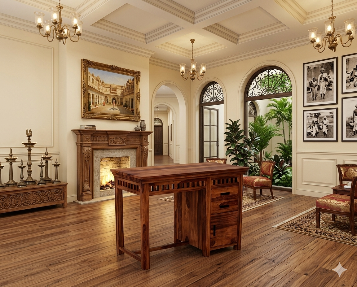 This exquisite office desk is handcrafted from authentic Kerala Nilambur Teak Wood, showcasing the deep, multi-tonal grain and robust character that makes this timber world-renowned. The design blends traditional craftsmanship with functional utility, featuring a rich natural finish that highlights the wood’s inherent beauty.