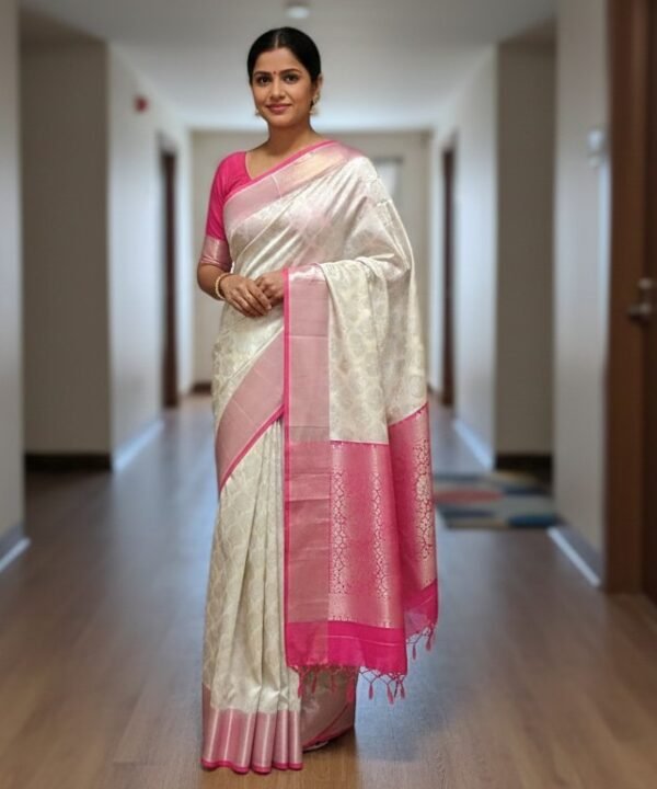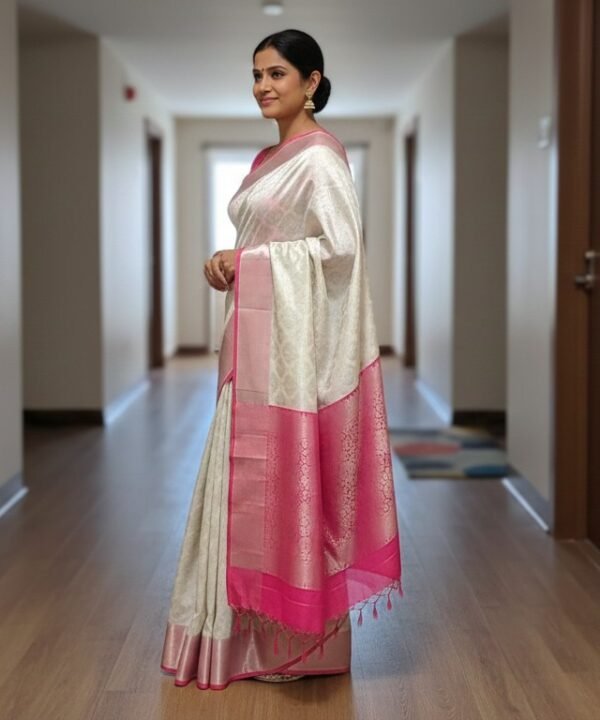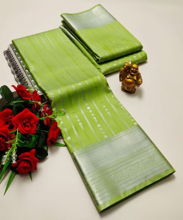 The broad silver zari border is detailed with traditional motifs, while the pallu carries rich zari weaving for a graceful finish. Crafted from soft lichi silk / soft Banarasi silk, the saree is lightweight, smooth to the touch, and easy to drape.