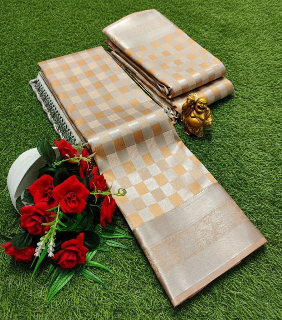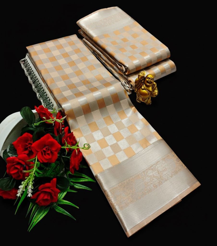 Cream Gold Soft Lichi Silk Saree with Silver Zari Checks