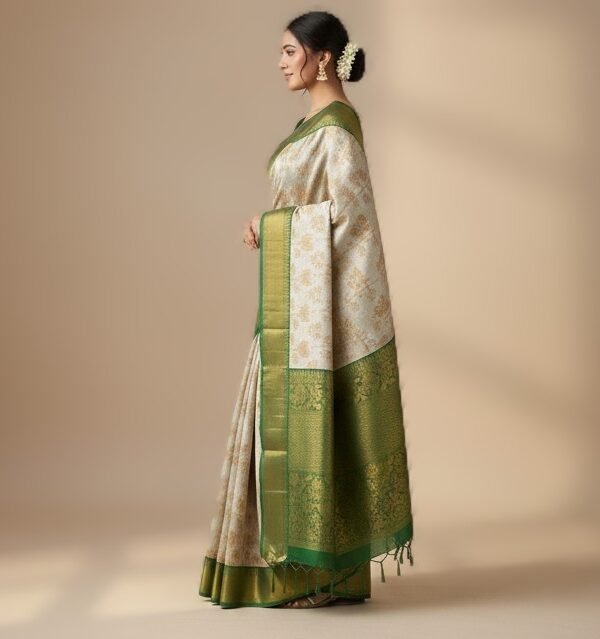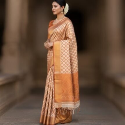 This elegant cream-gold saree features a classic checkered body woven with silver zari, offering a refined traditional look with a soft festive shimmer. The overall design is subtle yet rich, making it suitable for both weddings and celebrations.