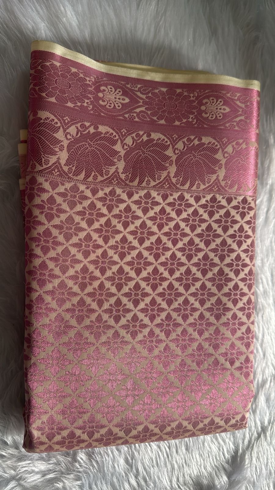 Rose Pink & Cream Banarasi Silk Saree with Floral Jaal. Radiate grace in this stunning Cream and Rose Pink Silk Saree. This masterpiece features a delicate cream-colored base overlaid with an all-over geometric floral jaal (network) woven in a rich rose pink thread. The wide, ornate border showcases traditional lotus and paisley motifs, adding a touch of heritage to this contemporary color palette.
