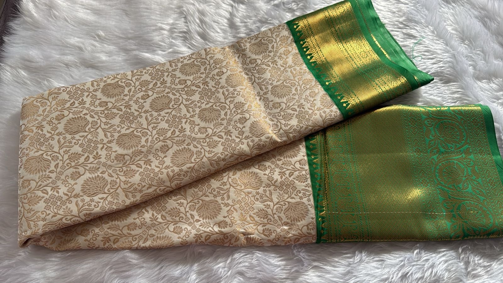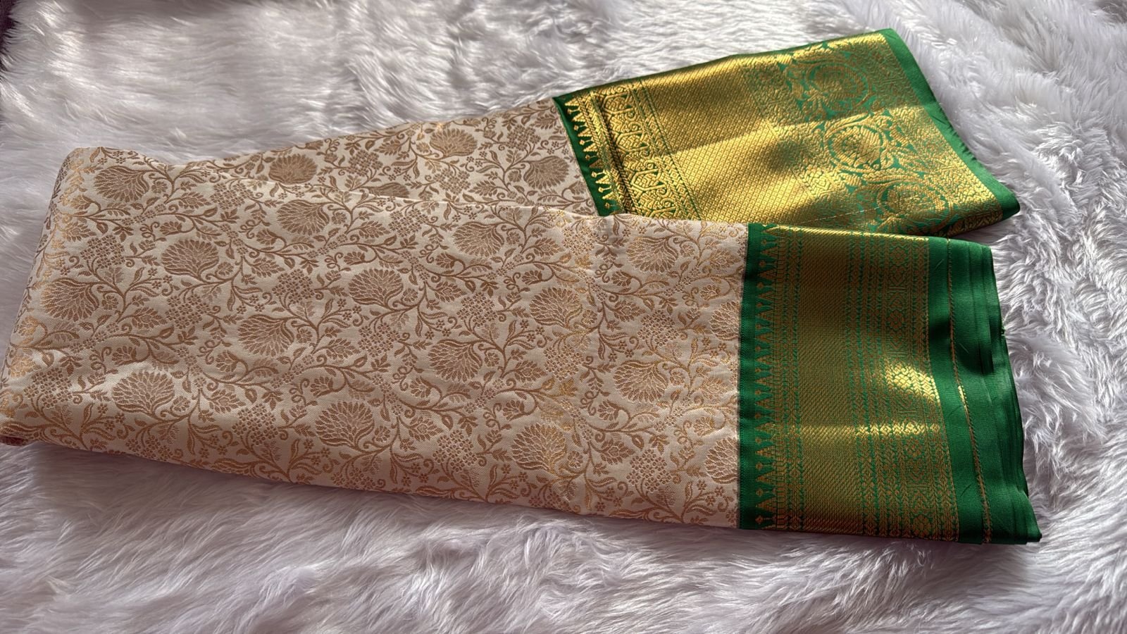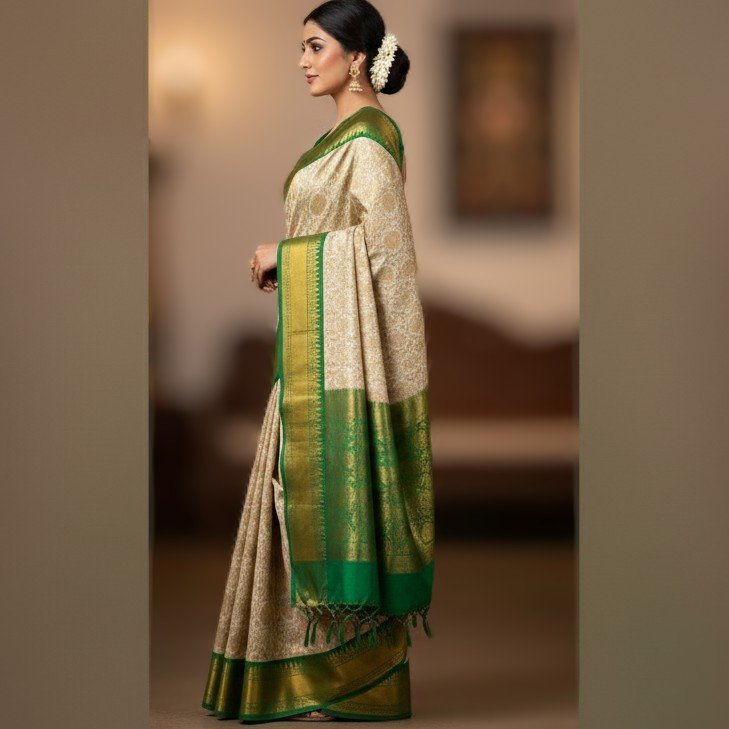 Elegant Cream & Emerald Green Banarasi Silk Saree