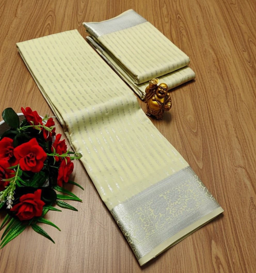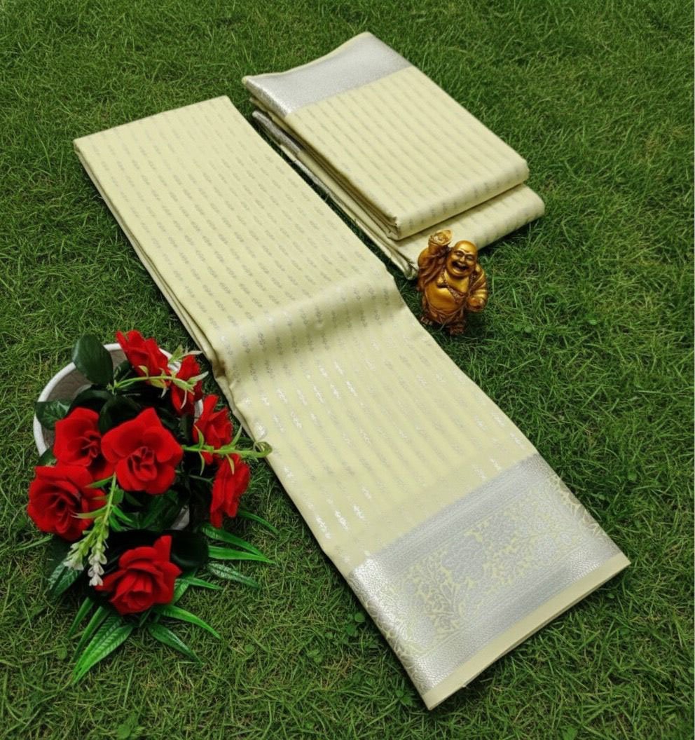 Soft ivory semi-silk saree with subtle silver zari stripes and a rich zari border, perfect for receptions and festive occasions.