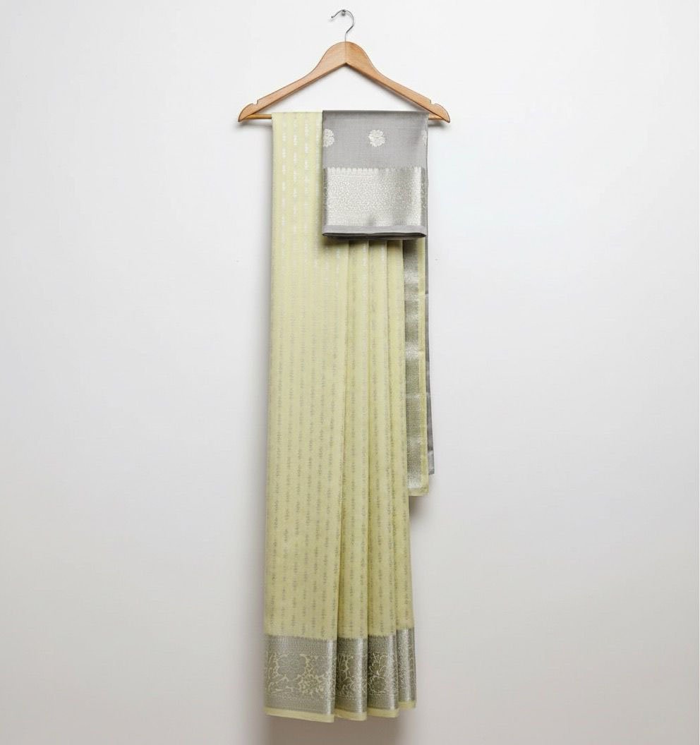 This elegant ivory saree is designed for women who prefer timeless minimalism with a refined festive touch. The saree features delicate vertical silver zari stripes along the body, paired with a beautifully detailed silver zari floral border. The pallu carries matching silver zari weaving, completing the rich yet subtle look.