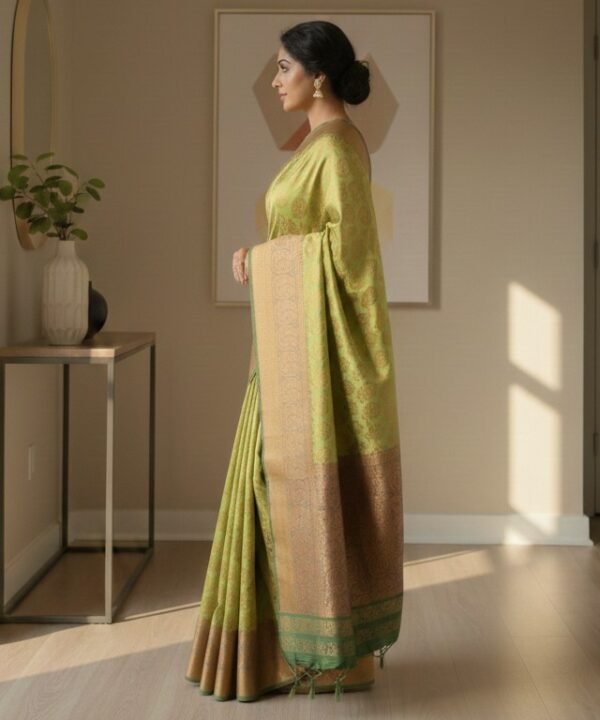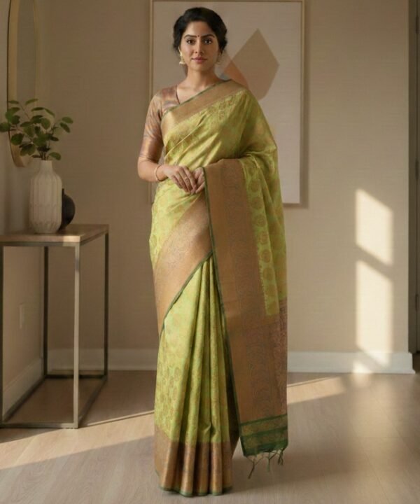 Crafted from a lightweight silk-blend fabric, this saree offers the shine of silk without the heaviness of traditional Kanjivaram, making it comfortable for long wear and easy styling.