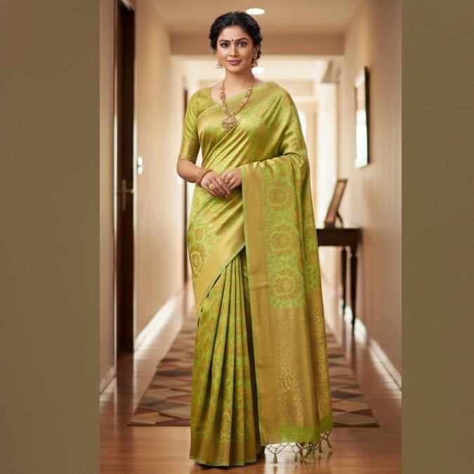 Elegant Lime Green & Gold Banarasi Silk Saree