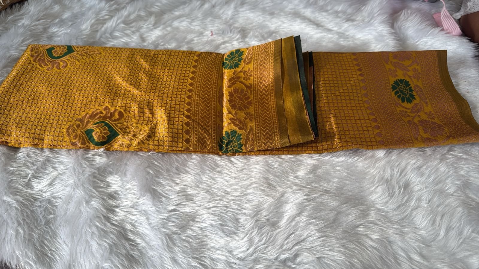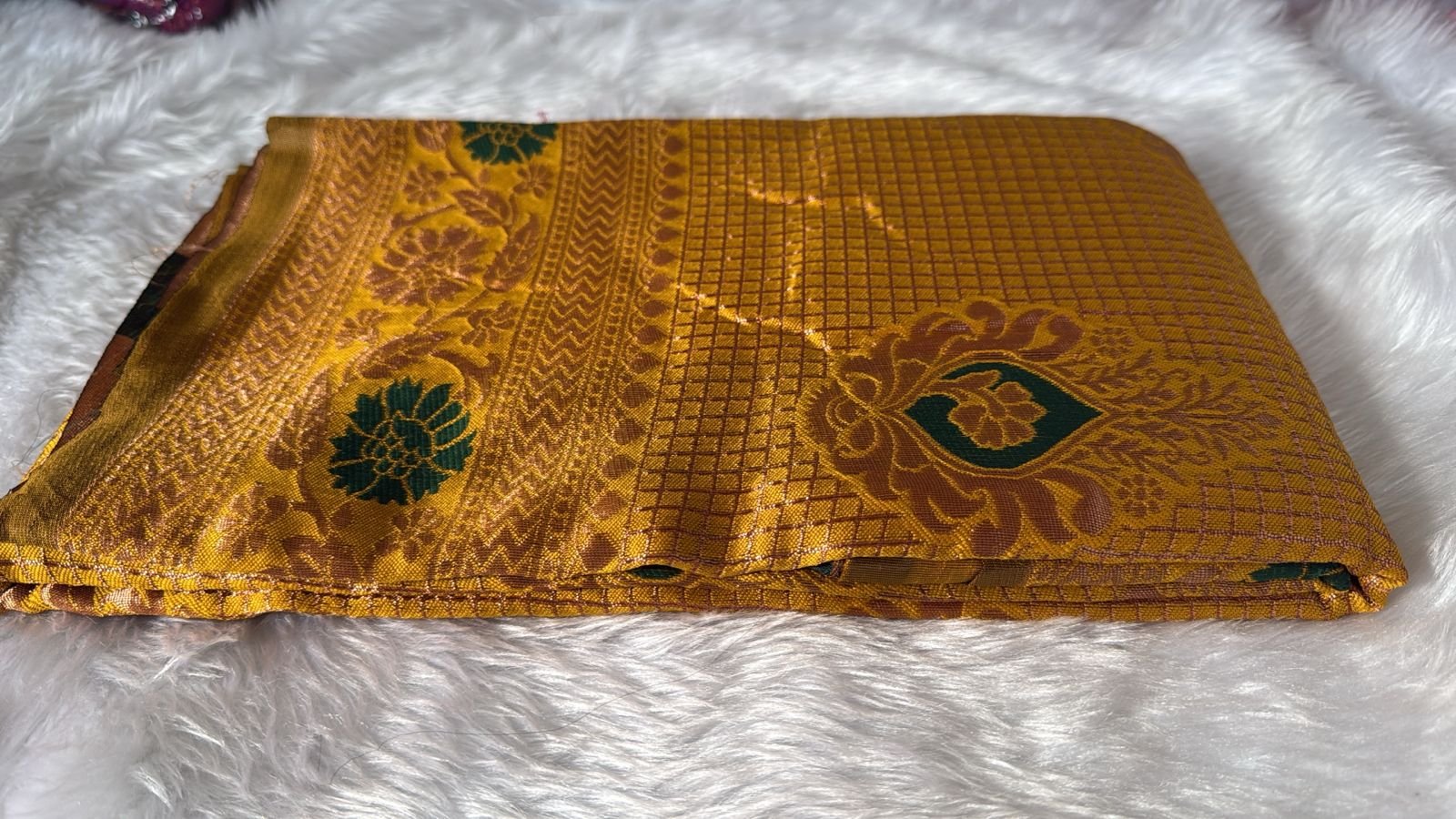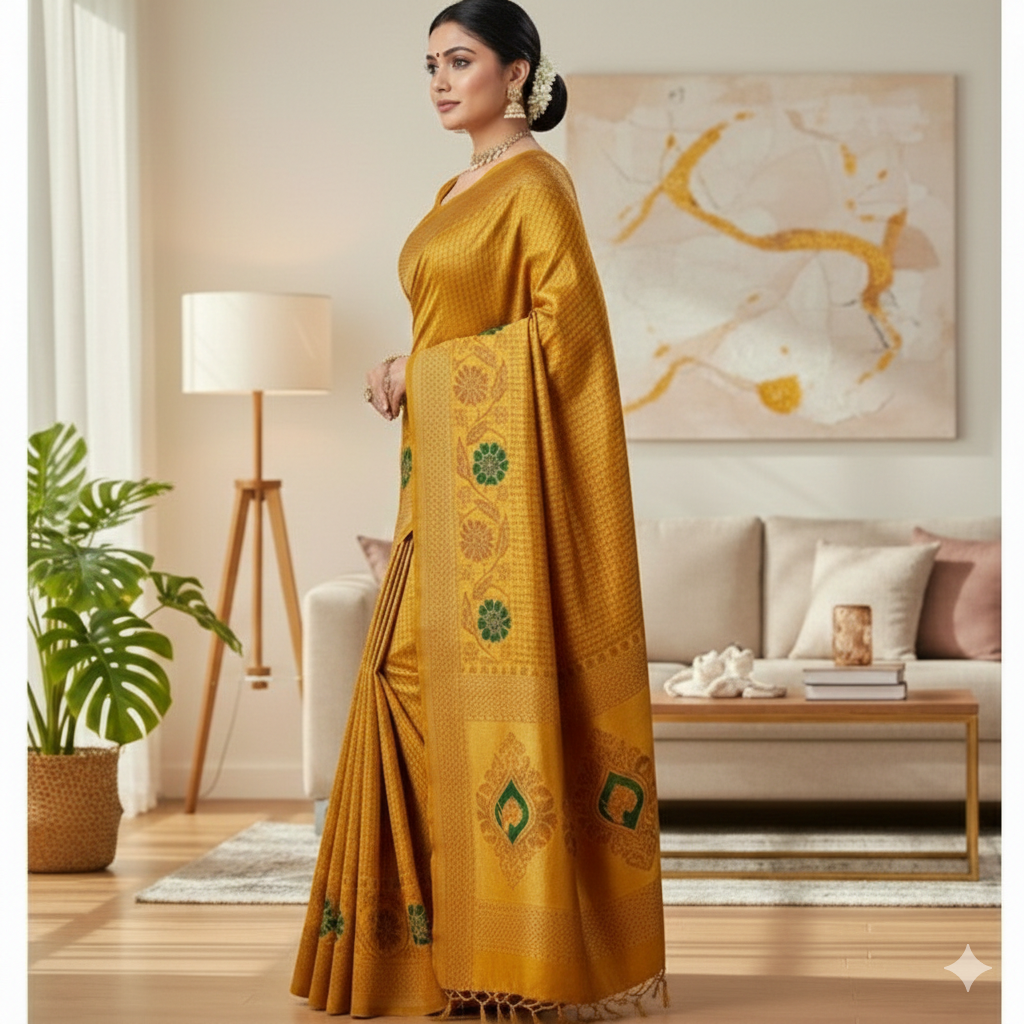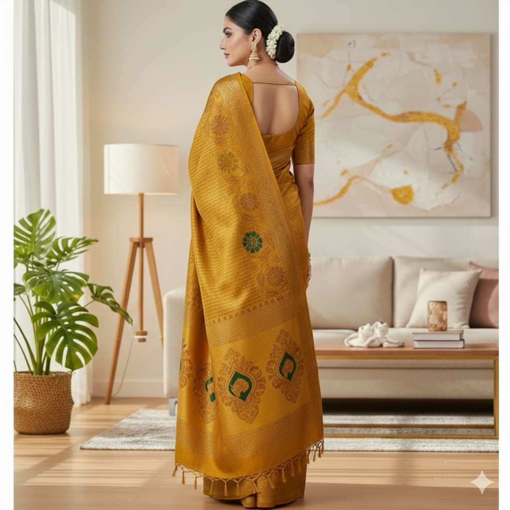 Embrace timeless elegance with this stunning Mustard Gold Banarasi Silk Saree, a perfect blend of traditional craftsmanship and contemporary grace. This saree is designed for the woman who loves to make a sophisticated statement at weddings, festivals, and high-profile events.