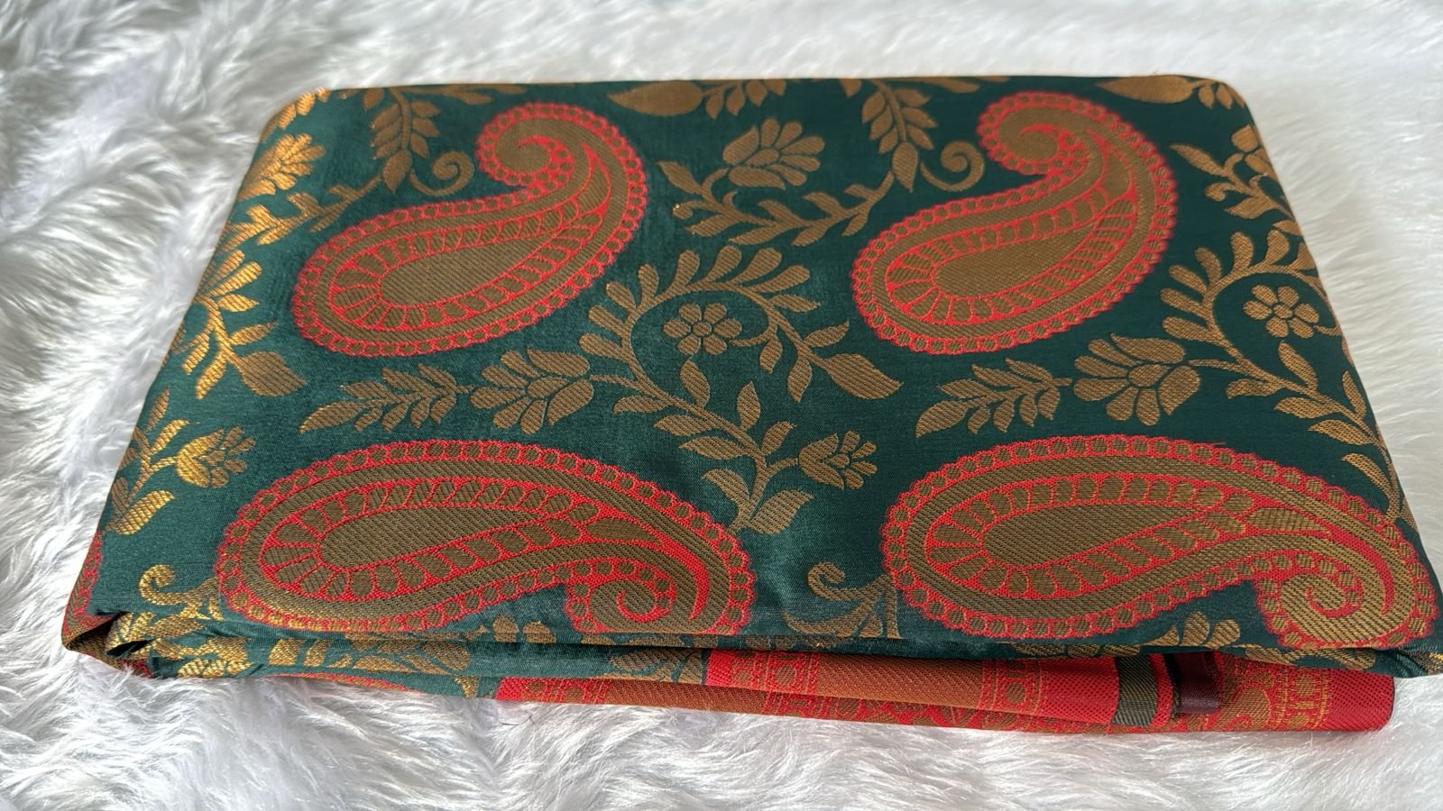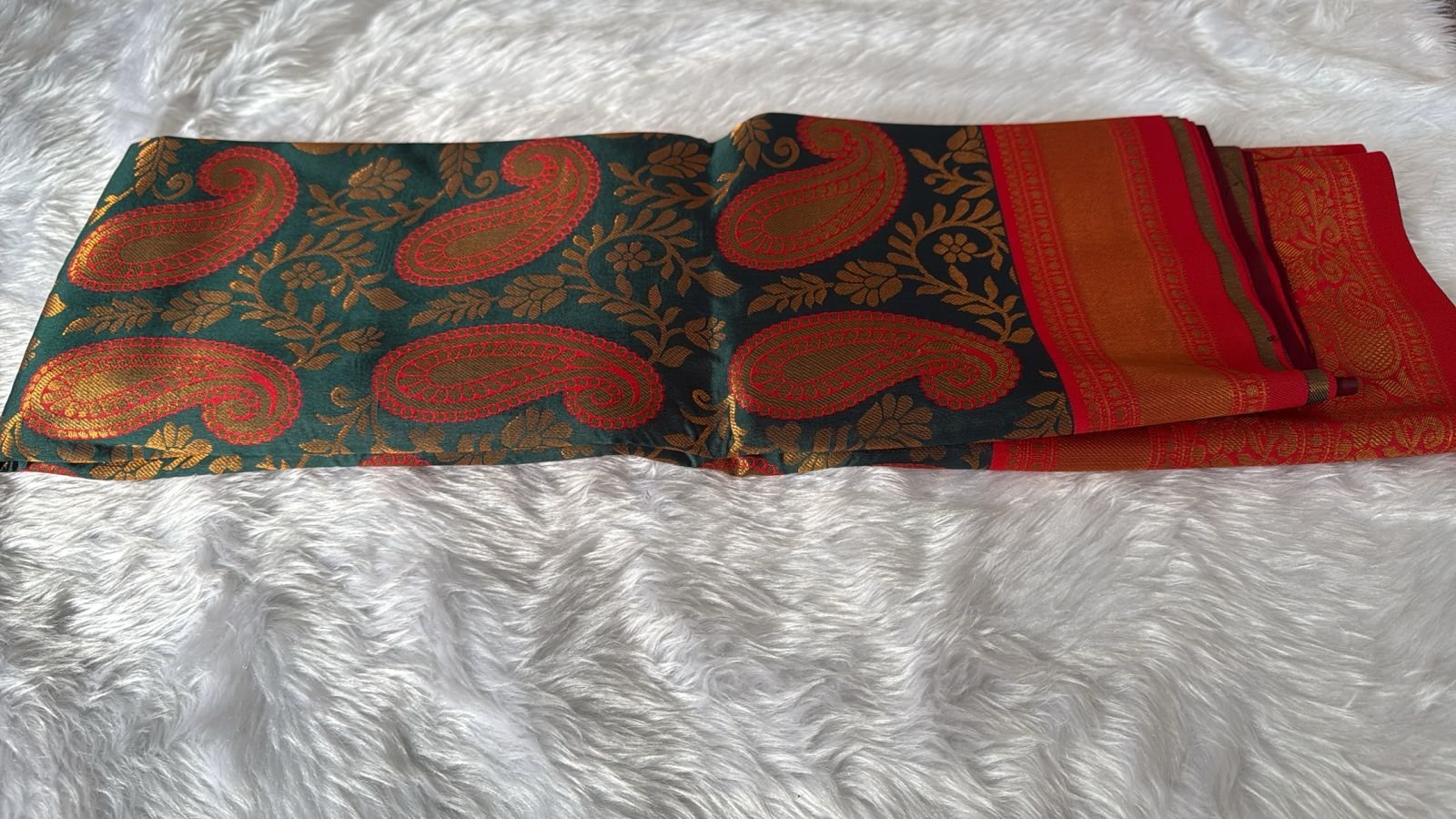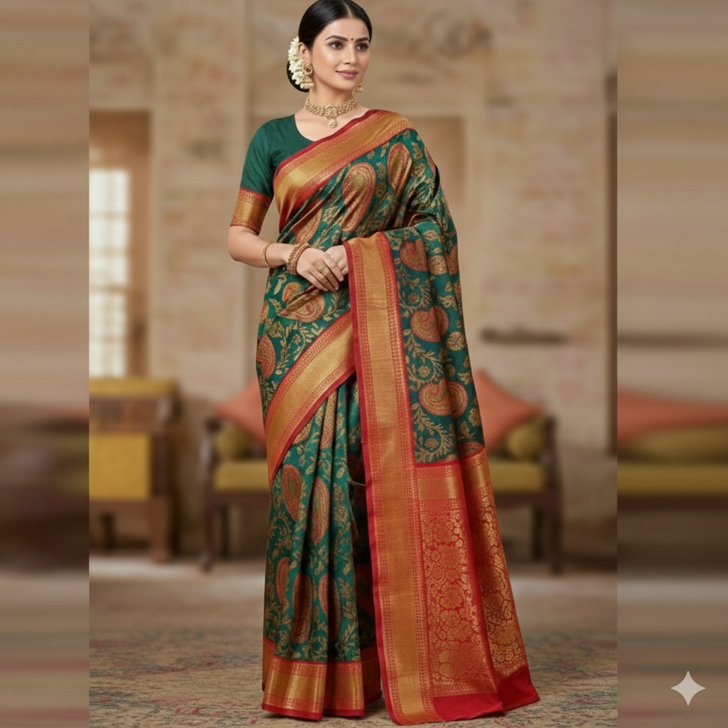 - Color Palette: A deep, regal Peacock Green body contrasted beautifully with a vibrant Crimson Red border and pallu.