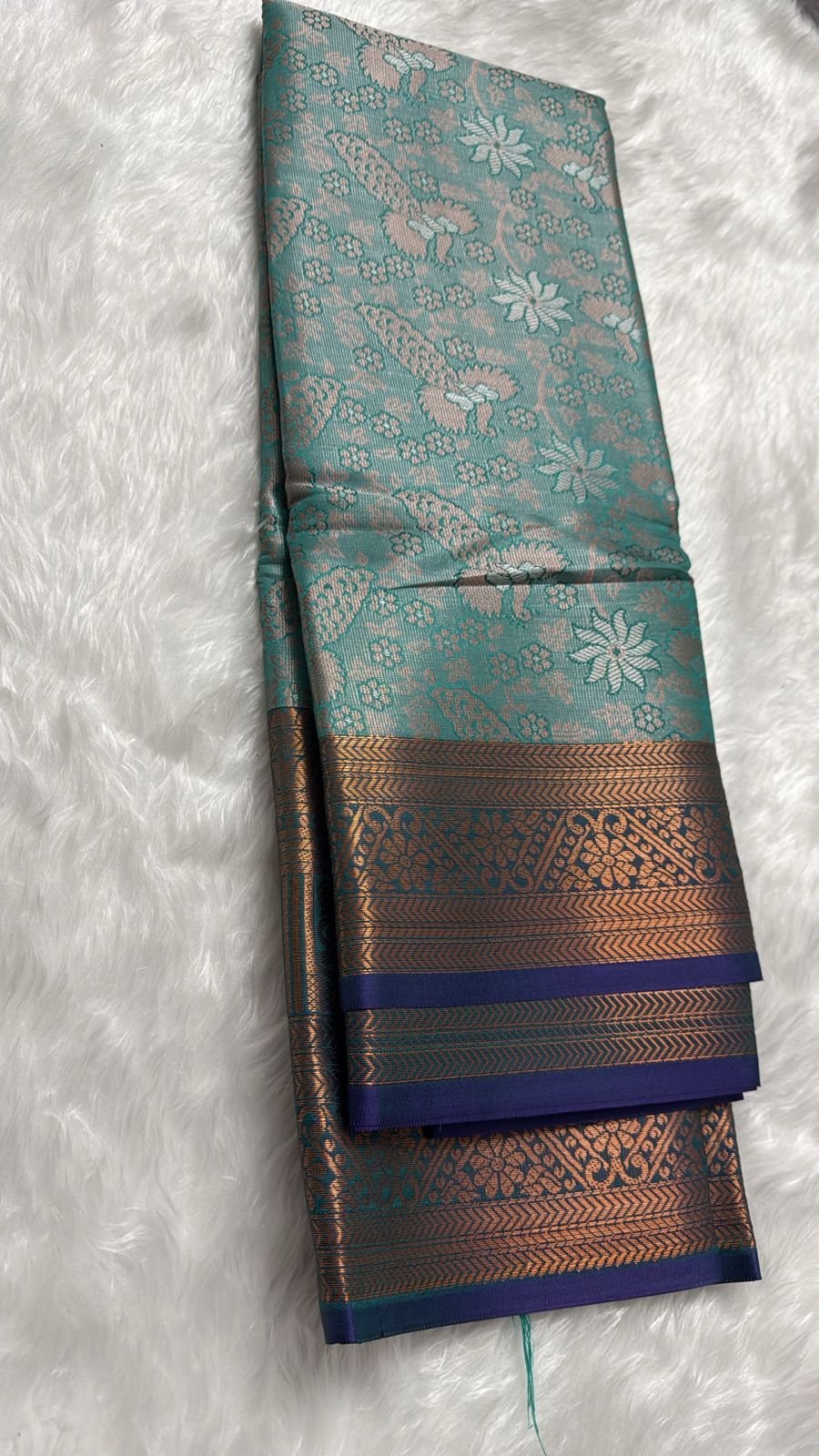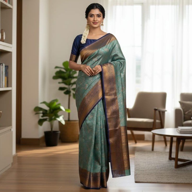 Elevate your ethnic wardrobe with this masterpiece of traditional craftsmanship. This exquisite Banarasi Silk Saree features a refreshing seafoam green body, beautifully contrasted by a sophisticated royal blue border and pallu.