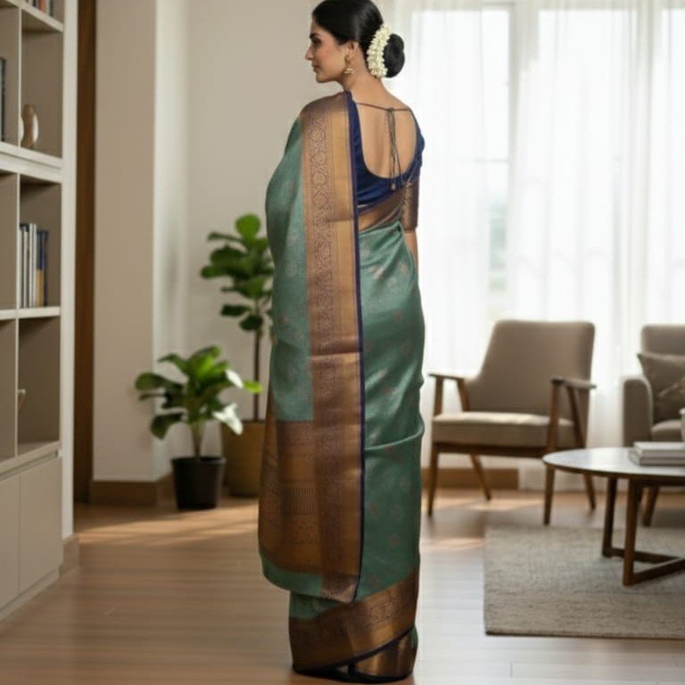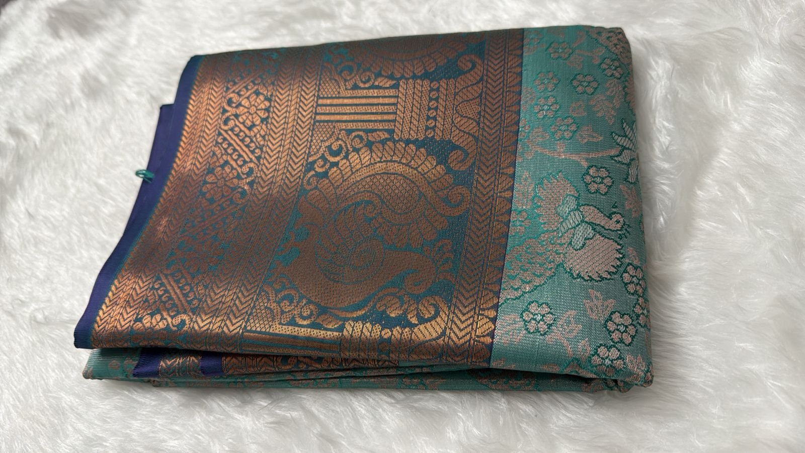 Elegant Seafoam Green & Royal Blue Banarasi Silk Saree with Antique Gold Zari