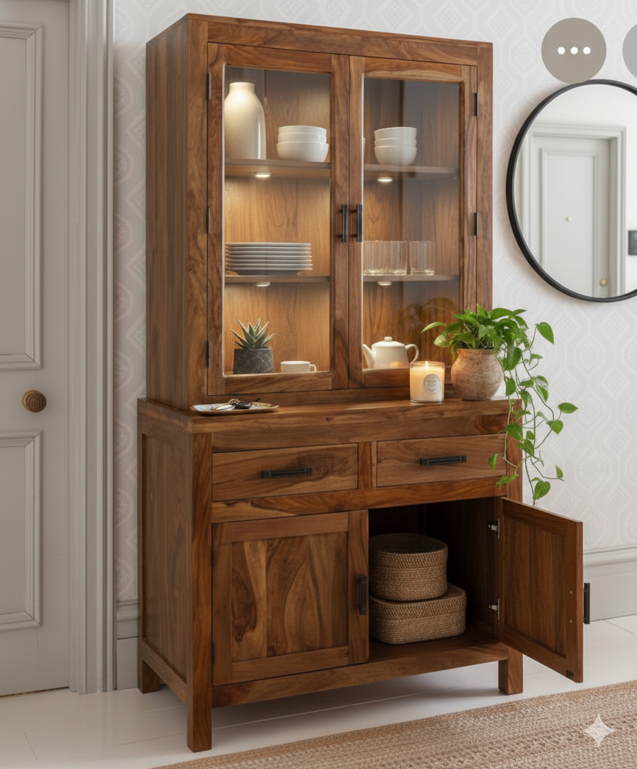 Elegant Solid Teak Wood Crockery Cabinet & Hutter