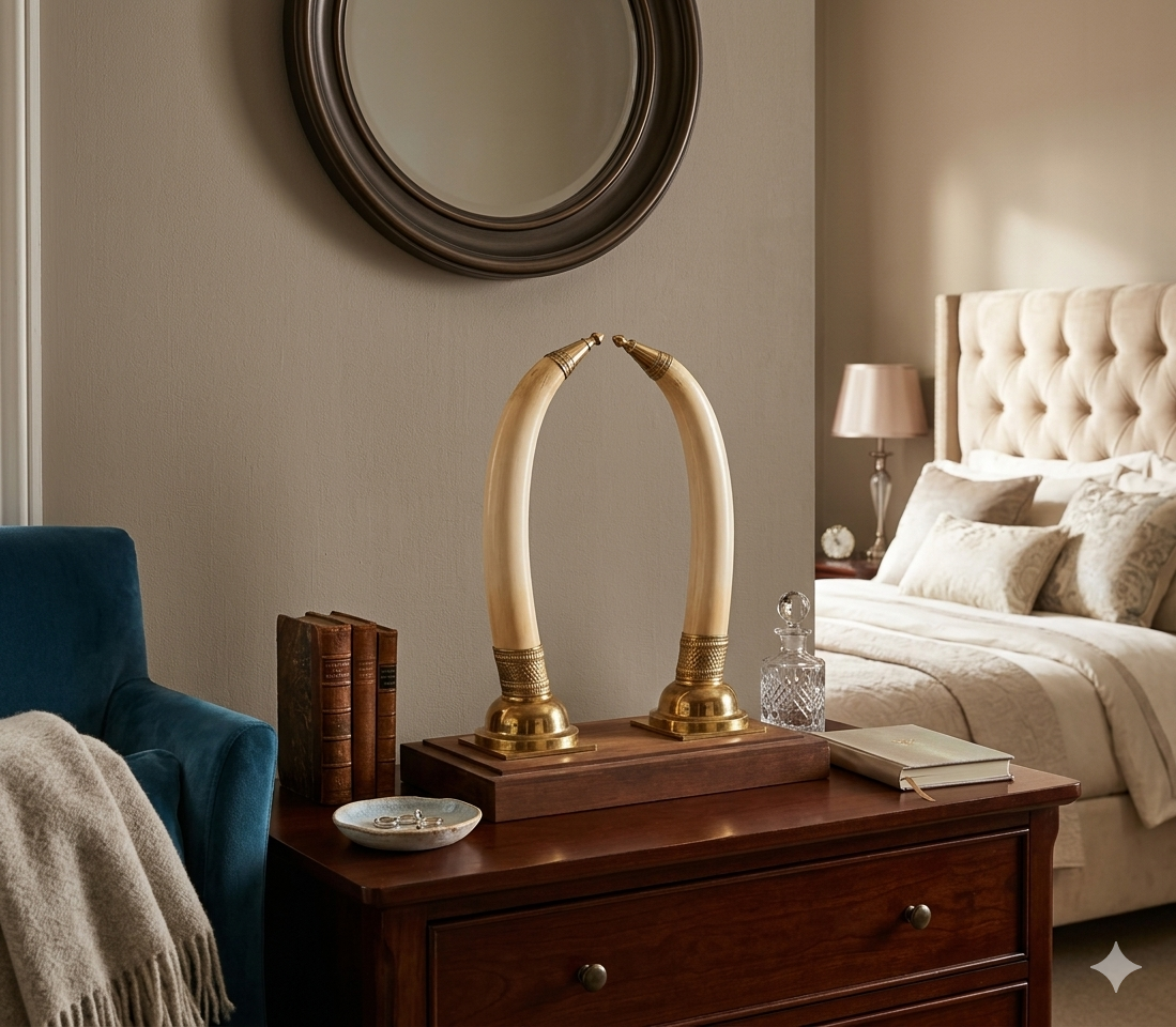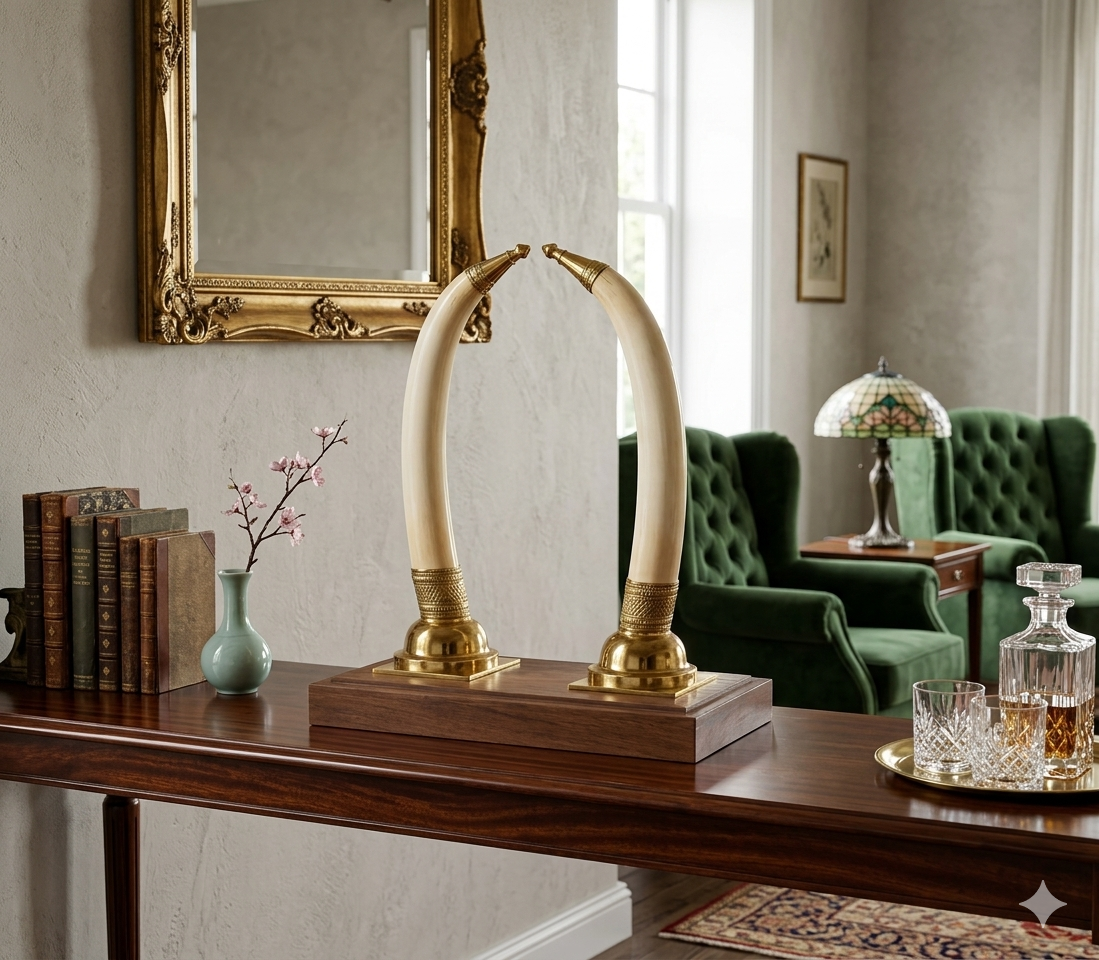- Design: Traditional Elephant Tusk Replica with Brass-Finish Pedestals