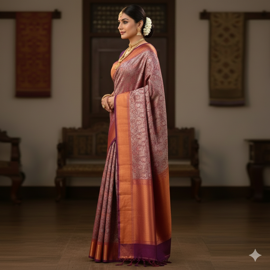 The highlight of this piece is the striking dual-toned border in rich copper-gold and deep violet, finished with delicate tassel detailing on the pallu. Paired with a matching violet silk blouse, this saree is designed for the woman who loves a look that is both regal and timeless.