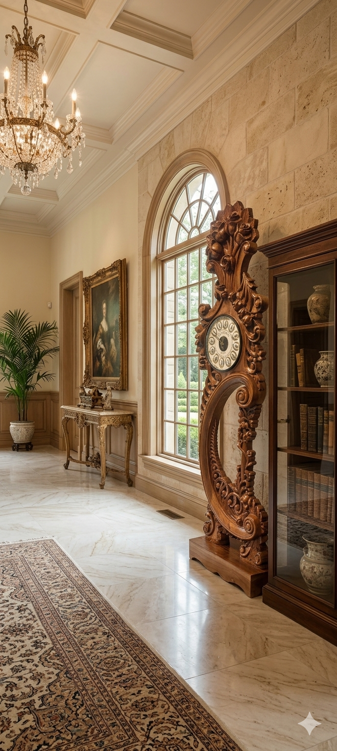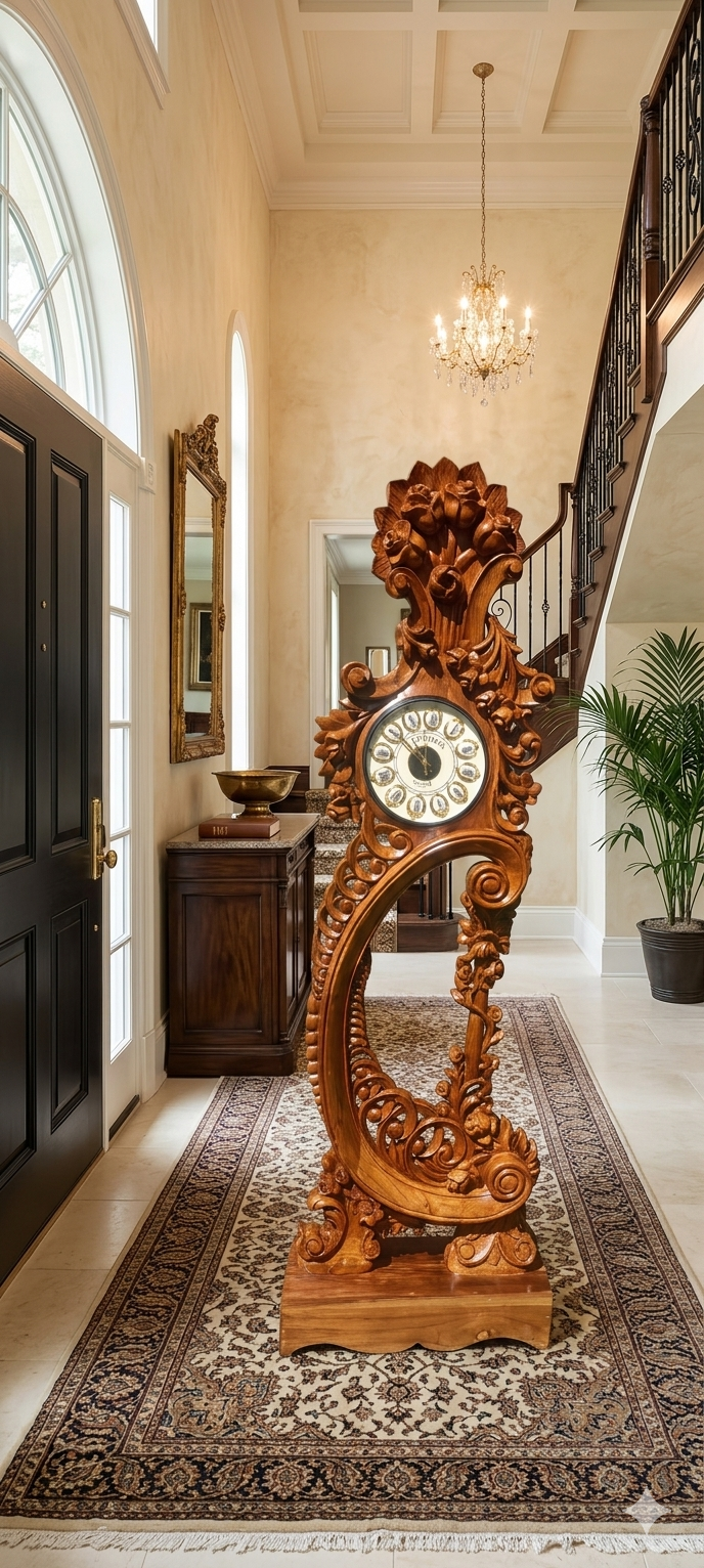 Elevate your home decor with this masterpiece of Kerala craftsmanship. This stunning floor clock is meticulously hand-carved from premium Nilambur Teak Wood, celebrated globally for its rich grain, durability, and natural resistance