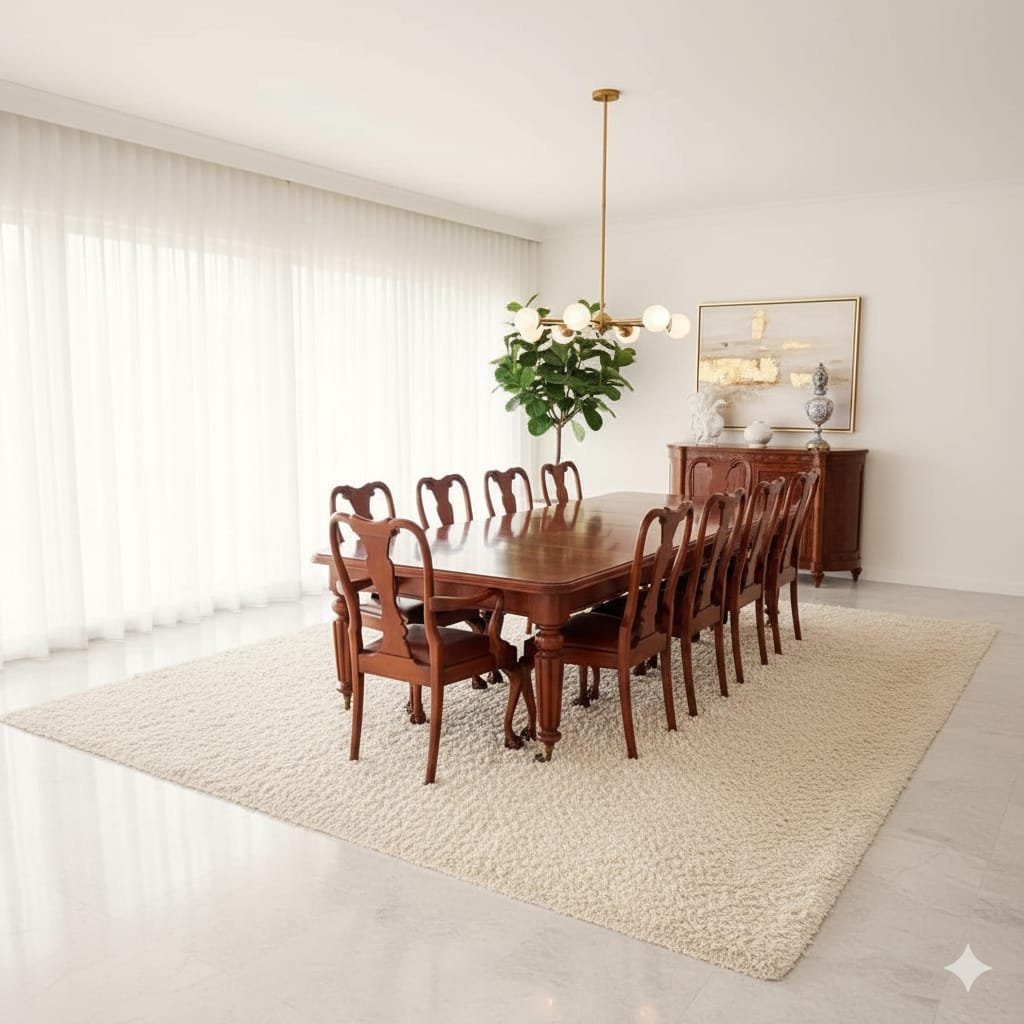 Capacity: Comfortably accommodates 10 to 12 chairs, making it an ideal centerpiece for a large formal dining room.