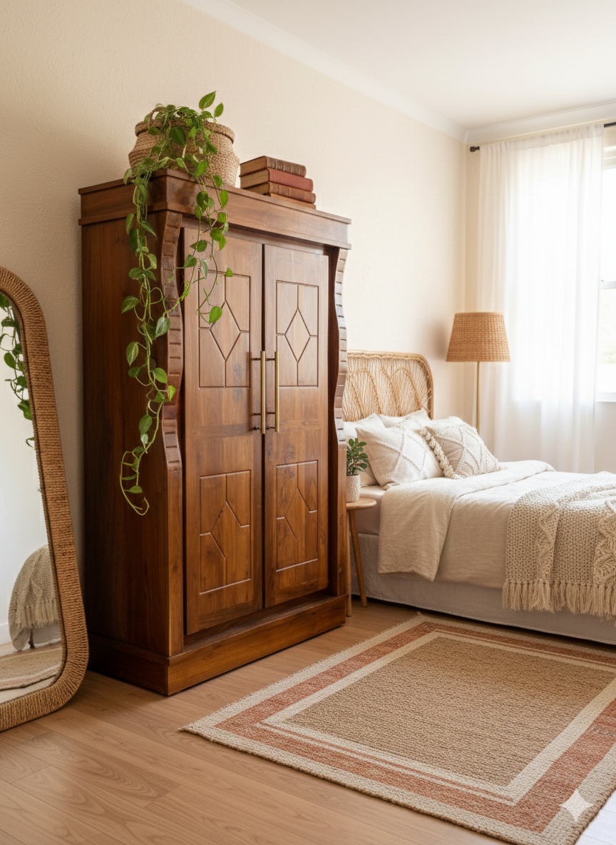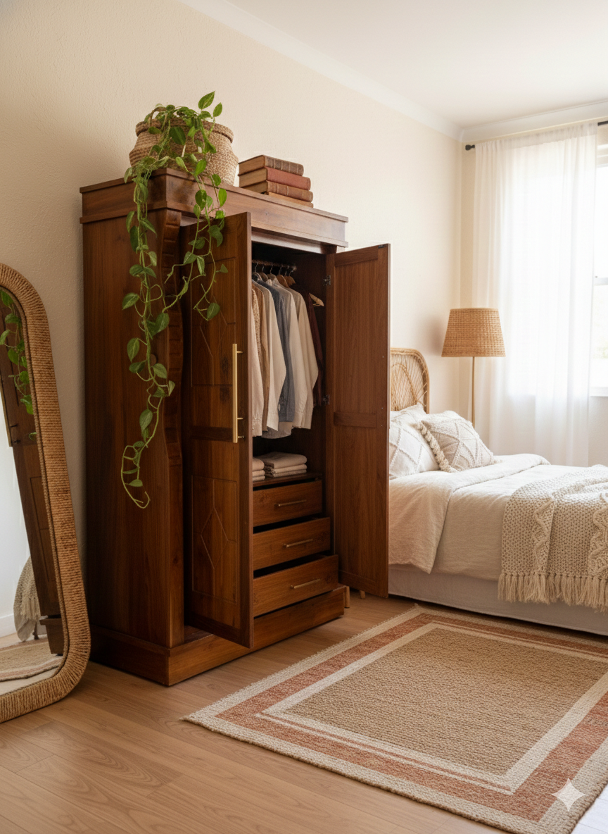 Add a touch of timeless elegance to your bedroom with this stunning, solid wood wardrobe. Crafted from high-quality timber with a rich, honey-toned finish, this piece stands out as a statement of traditional craftsmanship blended with unique architectural details.