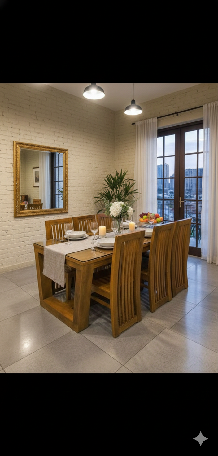 Elevate your dining space with this stunning, contemporary solid wood dining set. Designed with a perfect blend of rustic warmth and modern architectural lines, this set is a centerpiece that fits beautifully in both apartment hallways and formal dining rooms.