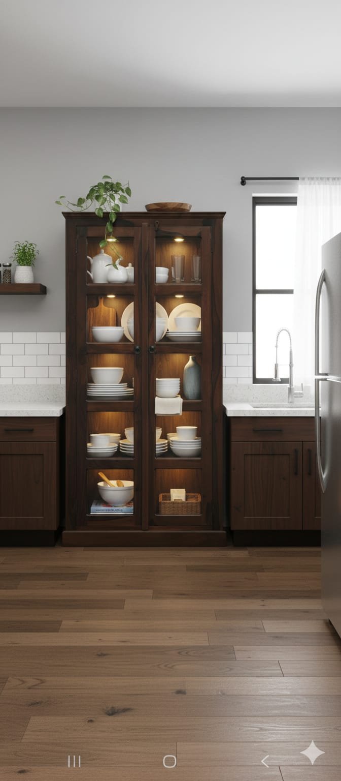 Elevate your kitchen or dining space with this timeless Solid Wood Display Cabinet. Crafted with a rich, dark walnut finish and elegant glass-paneled doors, this piece perfectly bridges the gap between traditional craftsmanship and modern apartment living.
