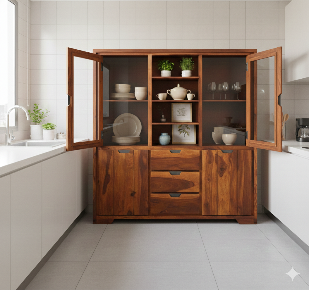 Crafted from the finest Nilambur Teak Wood, this premium crockery unit is a masterpiece of Kerala’s artisanal heritage. Known globally for its superior strength and rich, golden-brown grains, this teak wood furniture adds a warm, organic elegance to any modern kitchen or dining space.