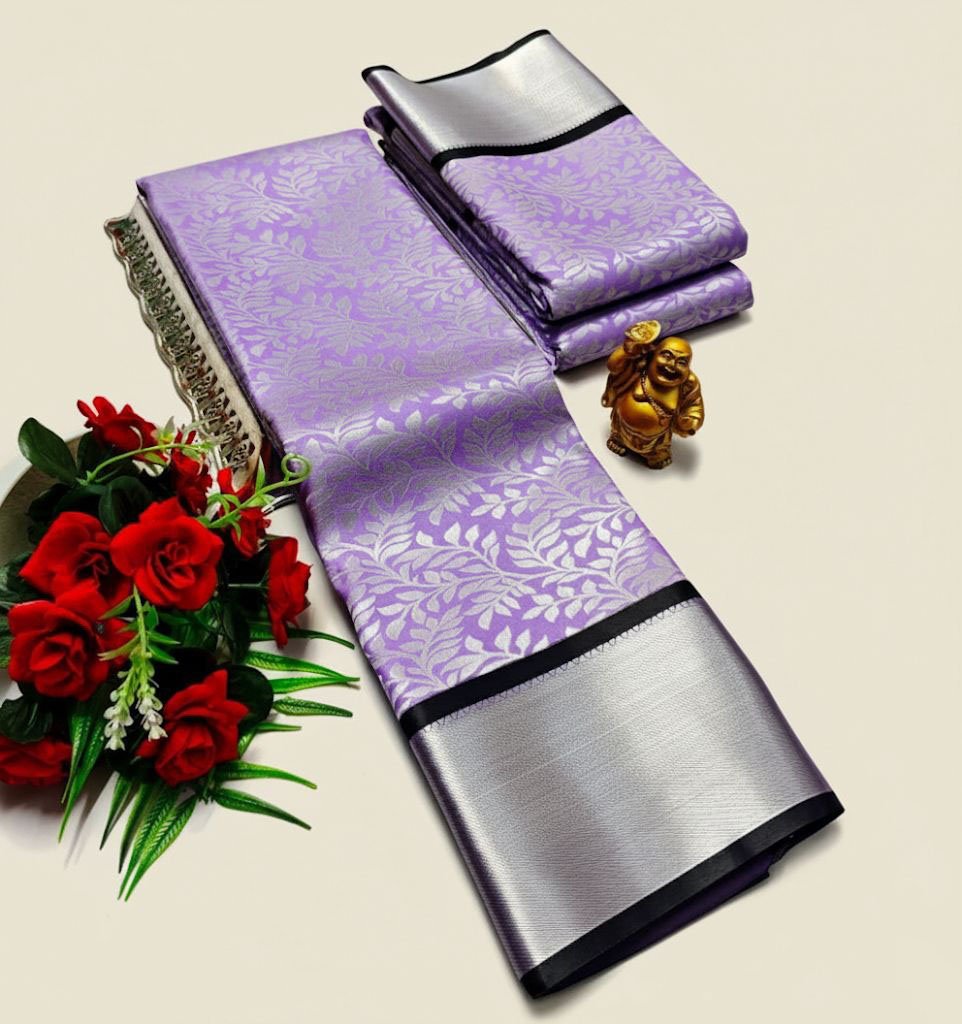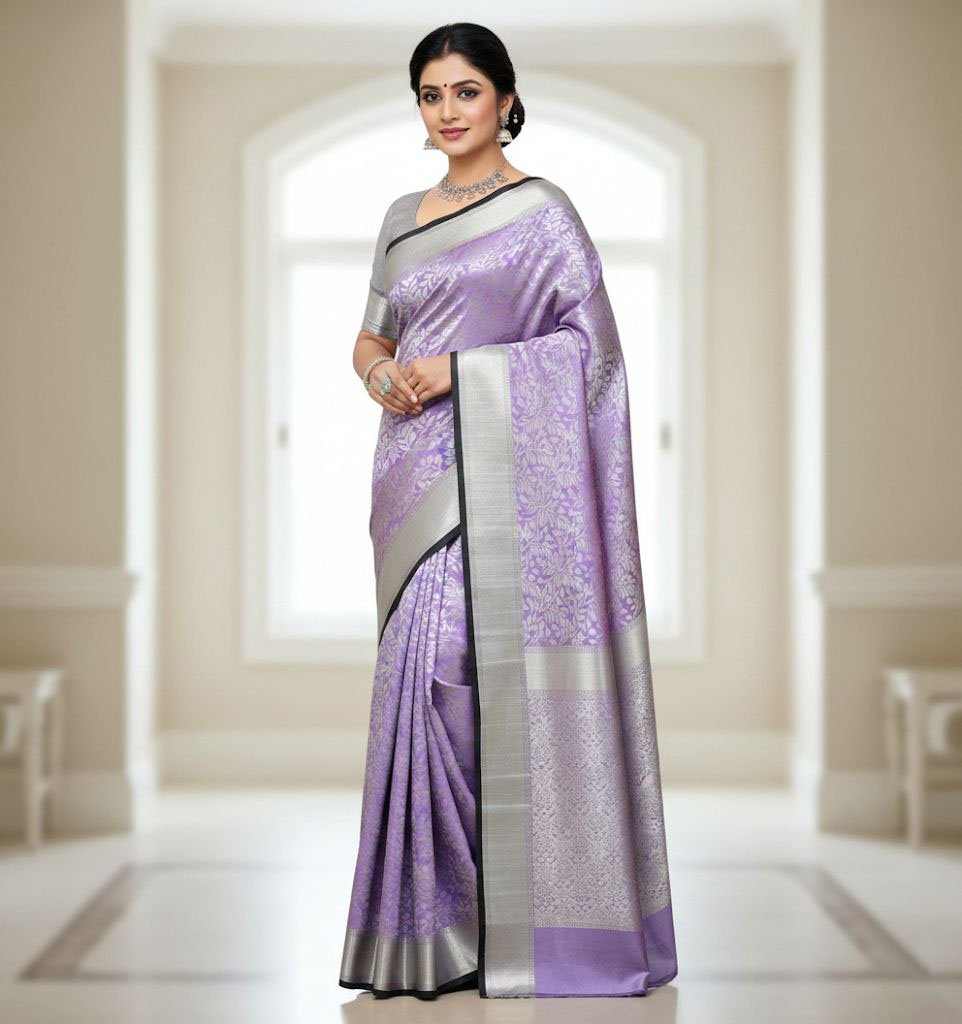 This refined lavender saree blends soft pastel elegance with modern contrast detailing. The entire body features a beautifully woven silver zari leaf-vine jacquard pattern, giving it a graceful shimmer without overpowering the look.
