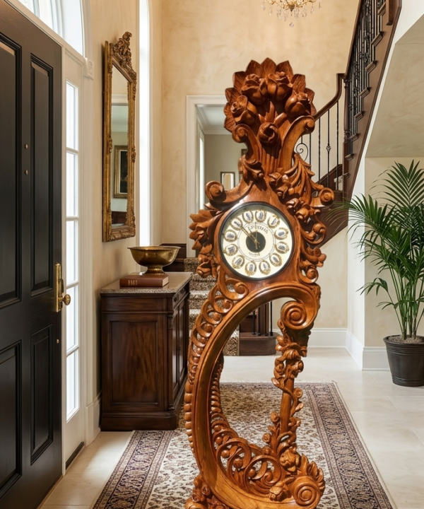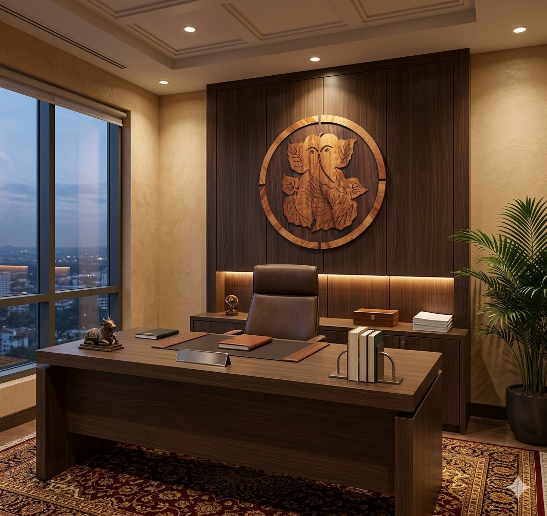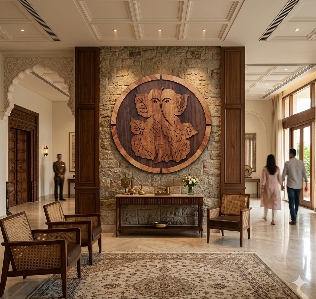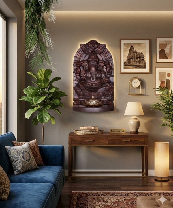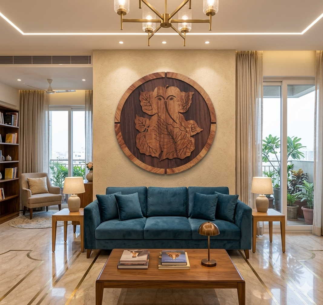 This exquisite circular wall hanging is a masterpiece of wooden inlay craftsmanship, featuring the iconic silhouette of Lord Ganesha Nilambur teak wood.