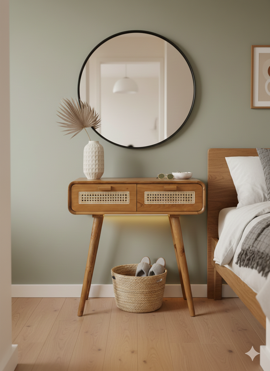 The standout feature is the dual-drawer design featuring authentic cane webbing (rattan) inlays, offering a beautiful tactile contrast against the smooth wood frame. Supported by elegant, tapered spindle legs, this table maintains a “light” visual footprint, making it an exceptional choice for narrow apartment hallways, entryways, or even as a stylish bedside vanity.